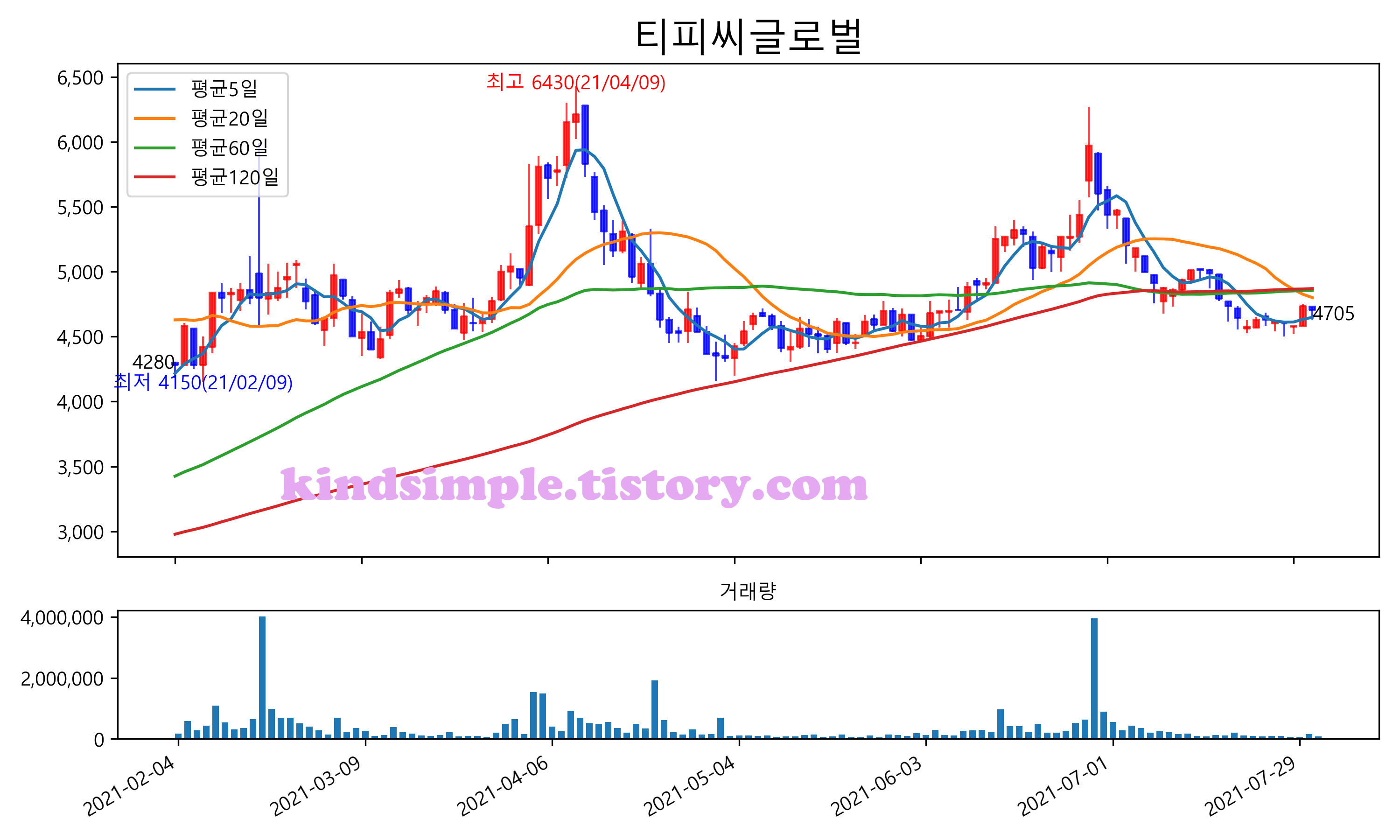 최근 6개월간 캔들차트 및 이동평균선입니다.