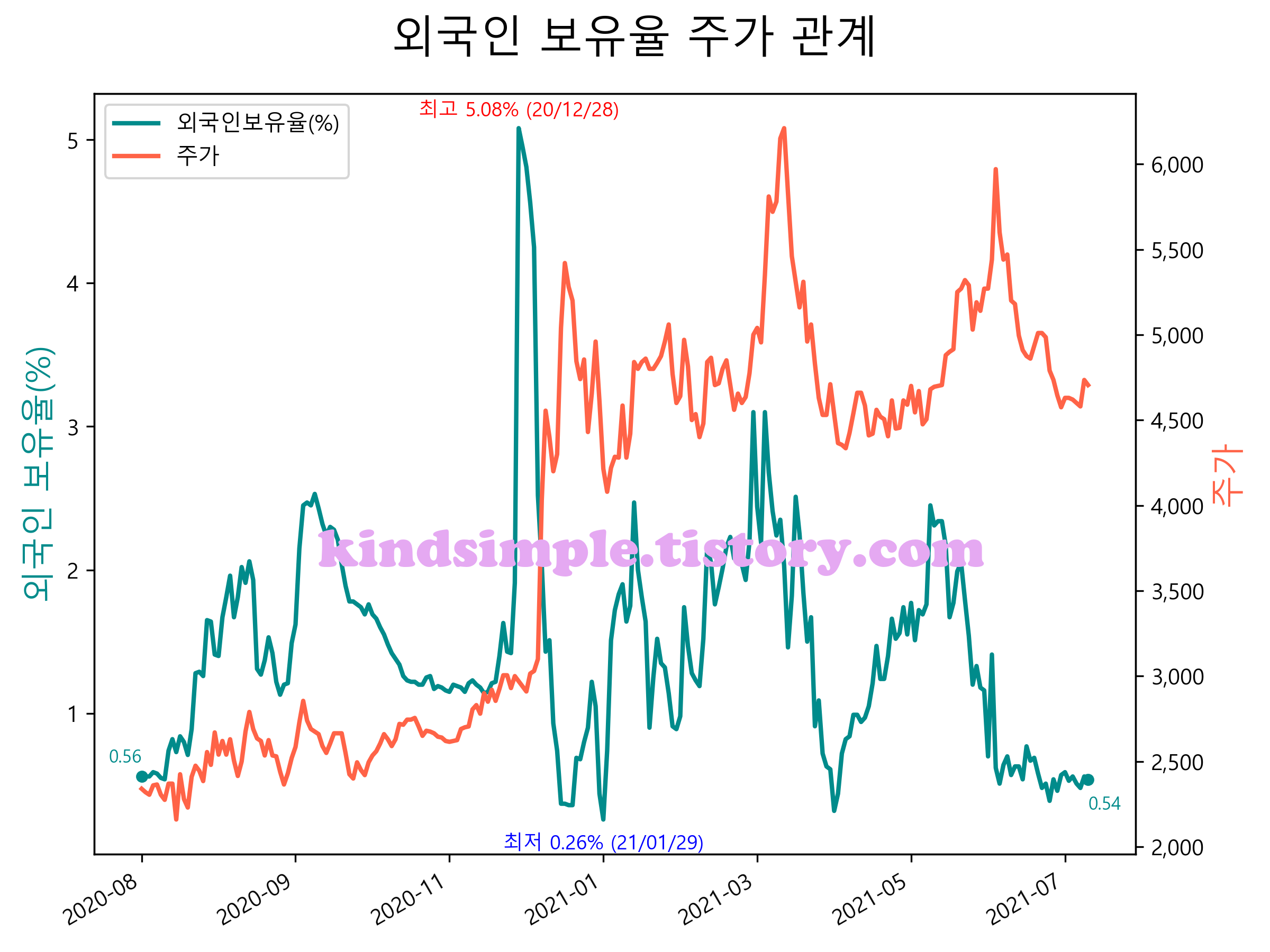 최근 1년간 외국인 보유율 및 주가와의 관계입니다.