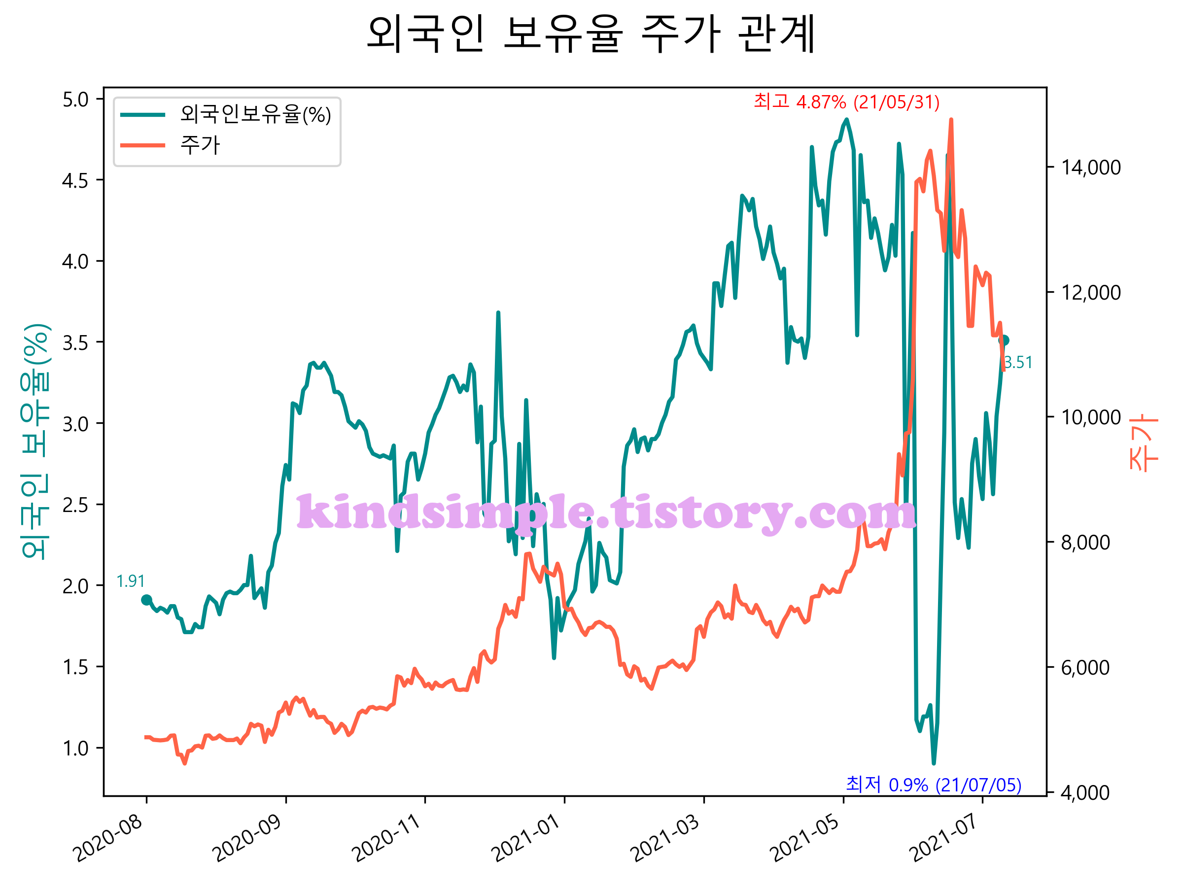 최근 1년간 외국인 보유율 및 주가와의 관계입니다.