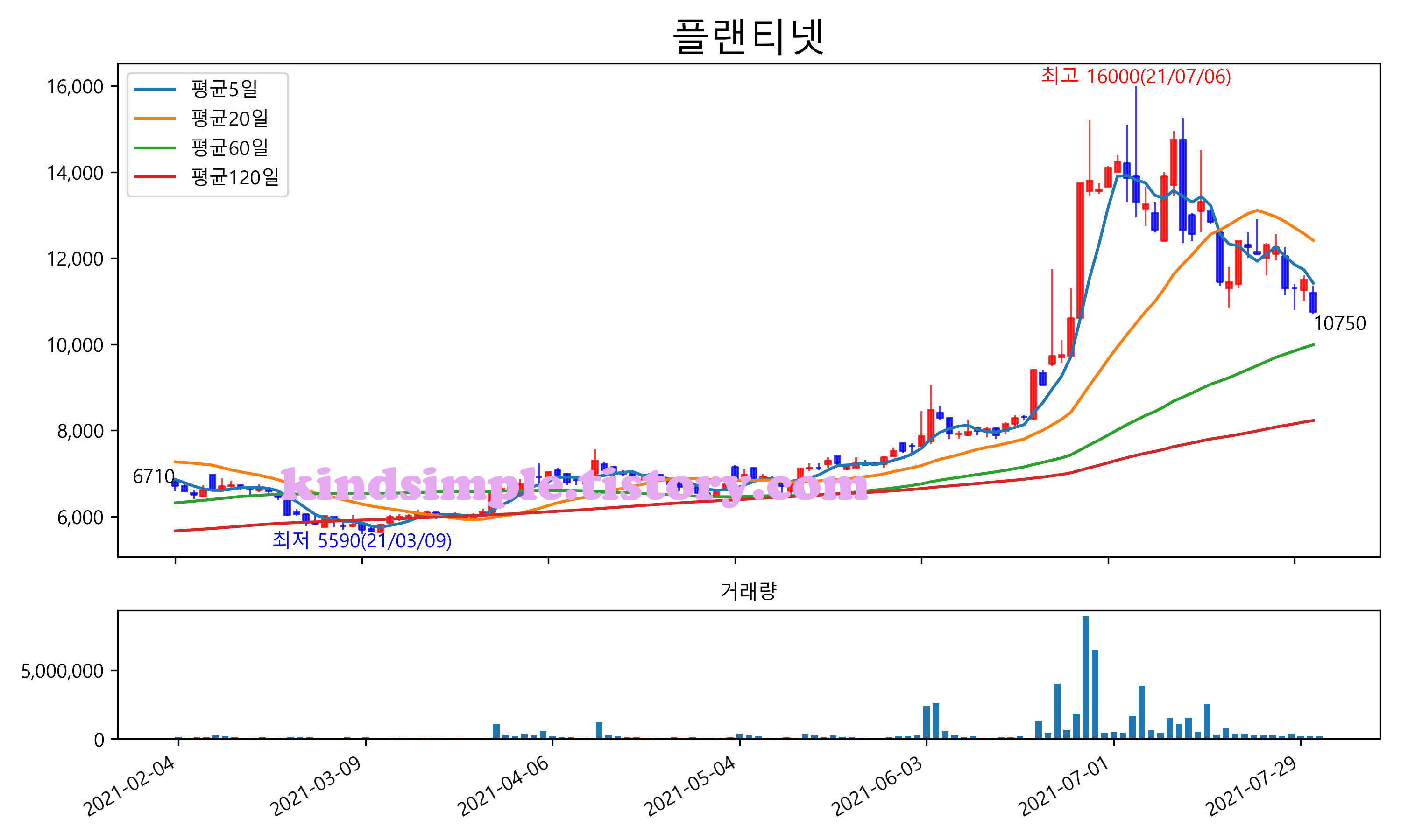 최근 6개월간 캔들차트 및 이동평균선입니다.