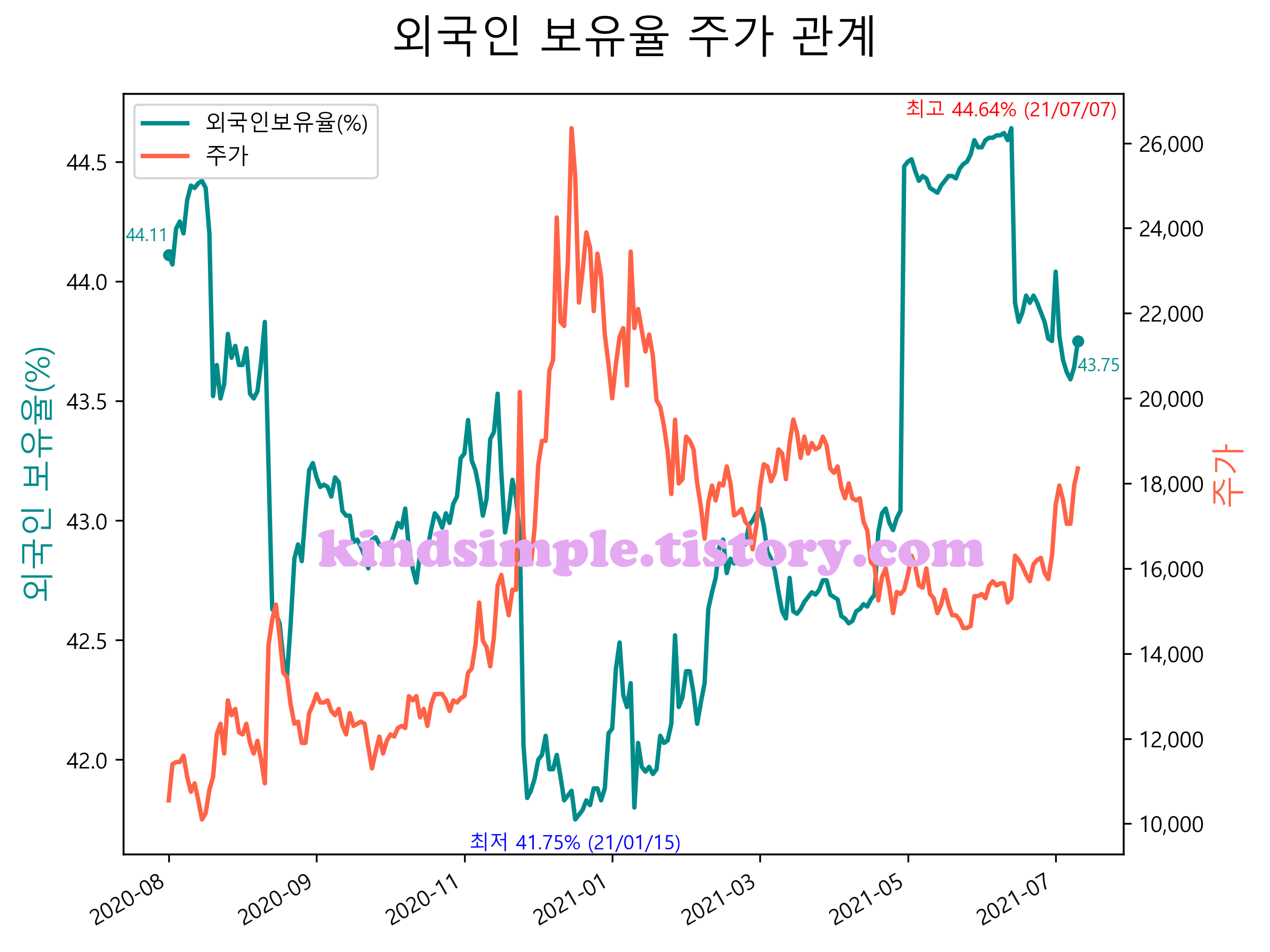 최근 1년간 외국인 보유율 및 주가와의 관계입니다.