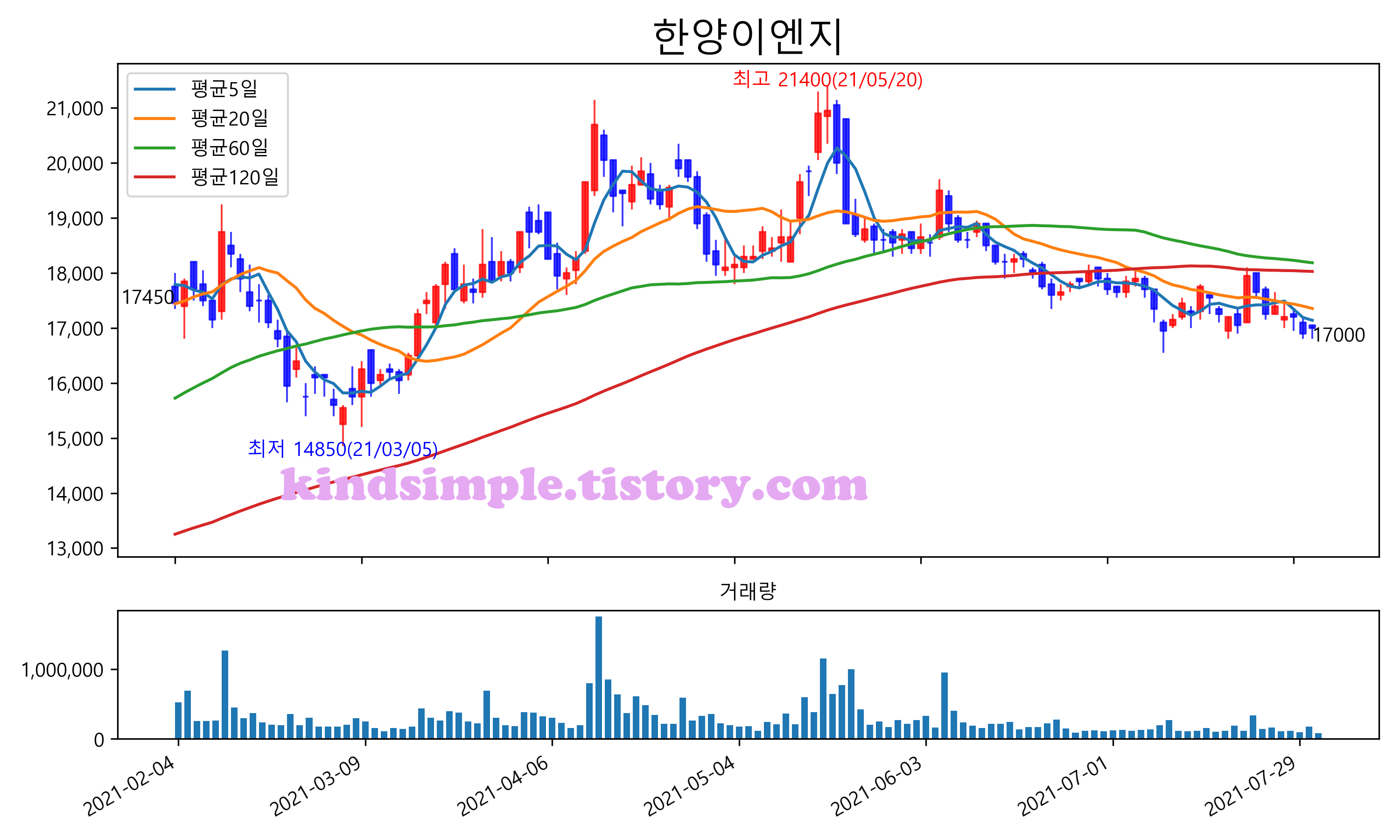 최근 6개월간 캔들차트 및 이동평균선입니다.