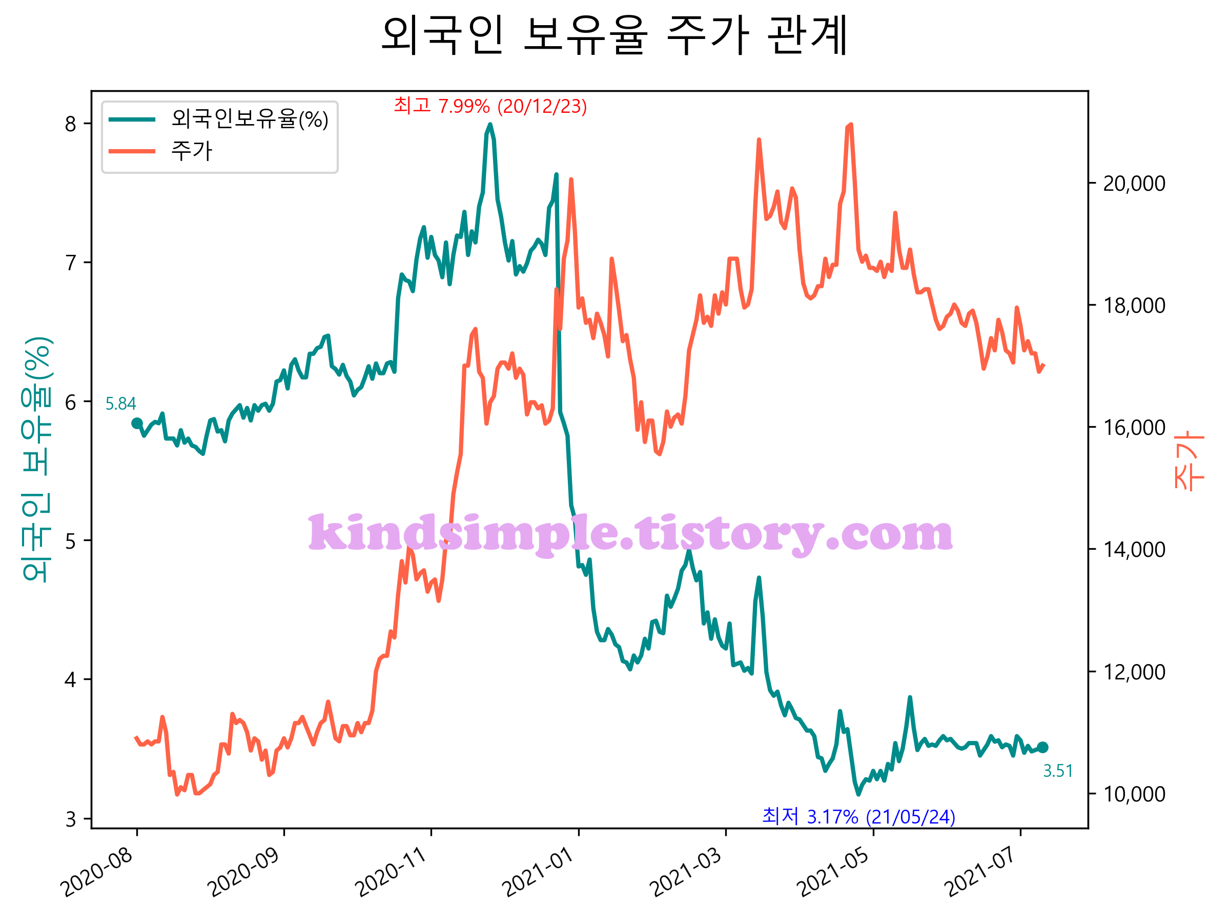 최근 1년간 외국인 보유율 및 주가와의 관계입니다.