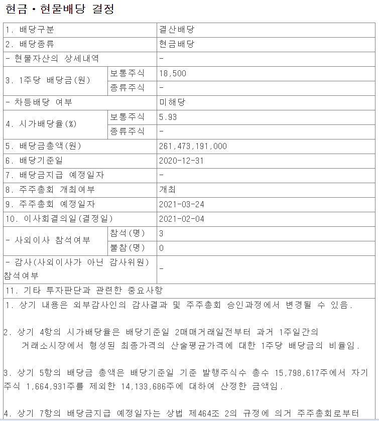 보통주는 18,500원이 배당되며, 시가배당율은 5.93% 입니다. 배당금 총액은 2614억원 규모입니다.