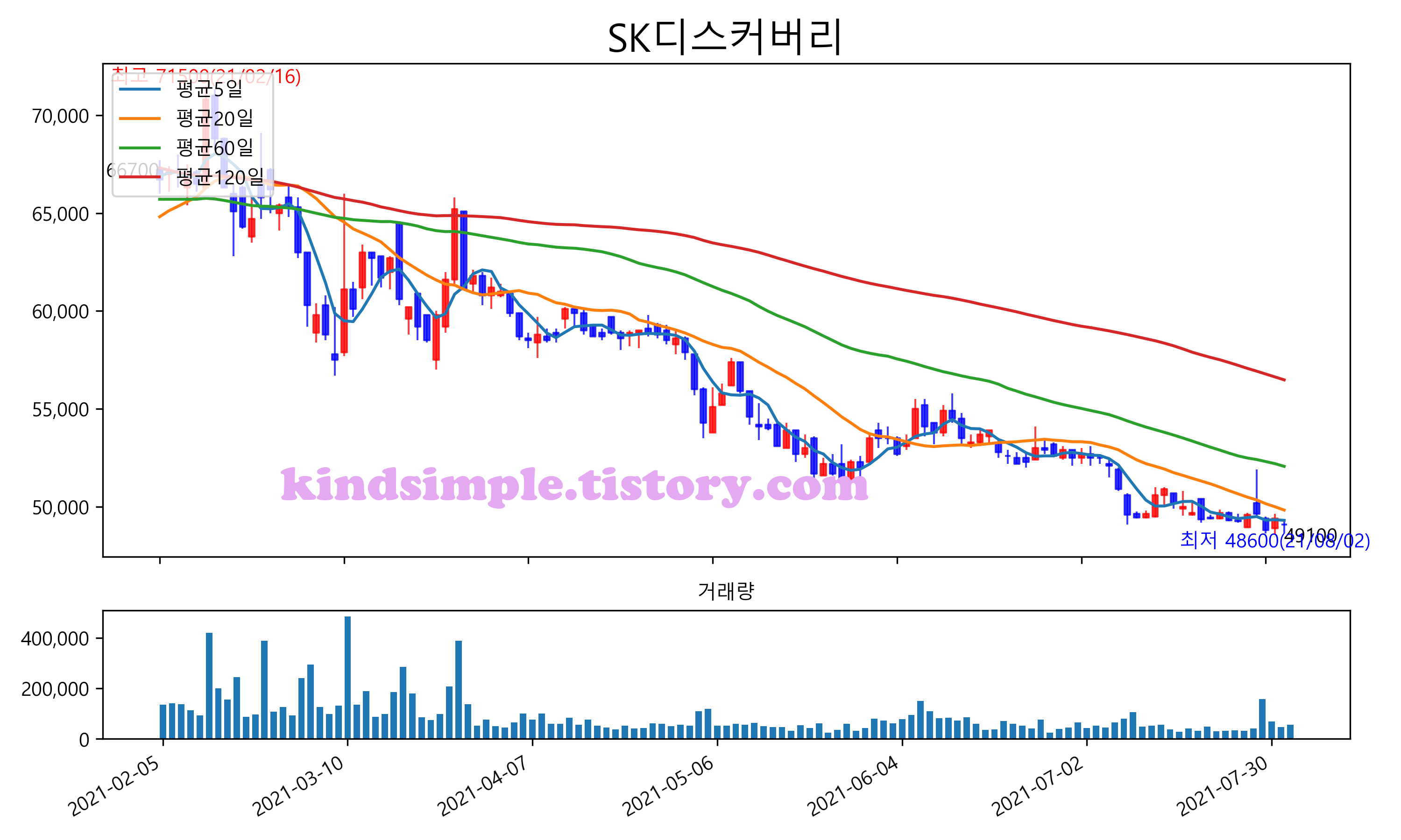 최근 6개월간 캔들차트 및 이동평균선입니다.