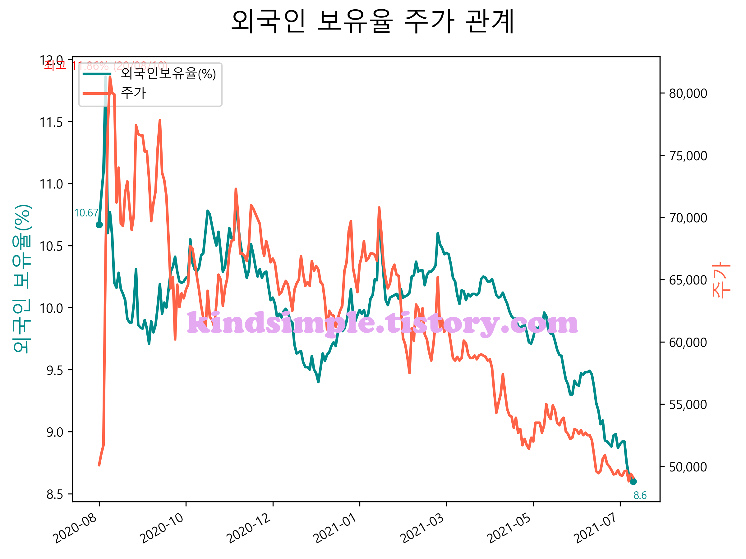 최근 1년간 외국인 보유율 및 주가와의 관계입니다.