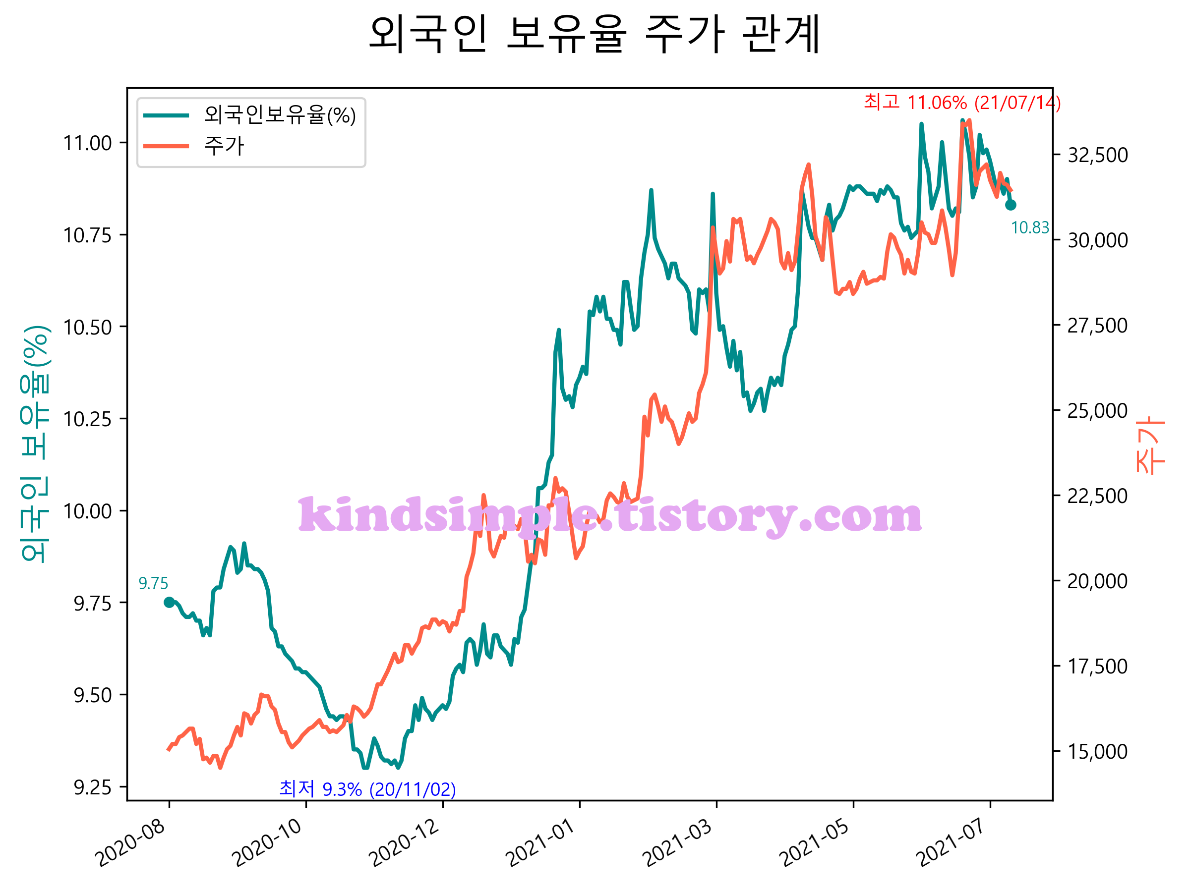 최근 1년간 외국인 보유율 및 주가와의 관계입니다.
