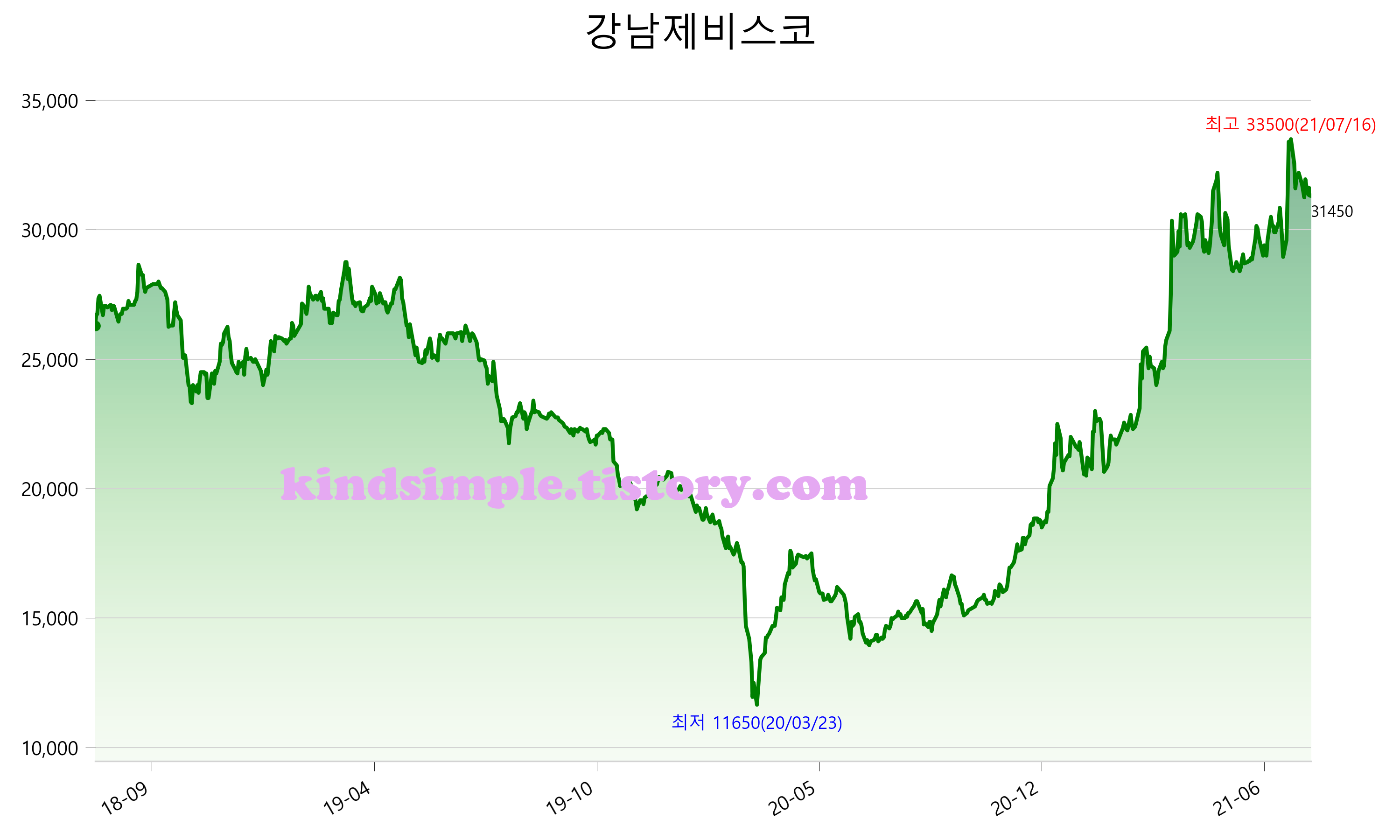 8월 4일 기준 주가는 31,450원 입니다. 아래는 최근 3년간의 주가흐름입니다.