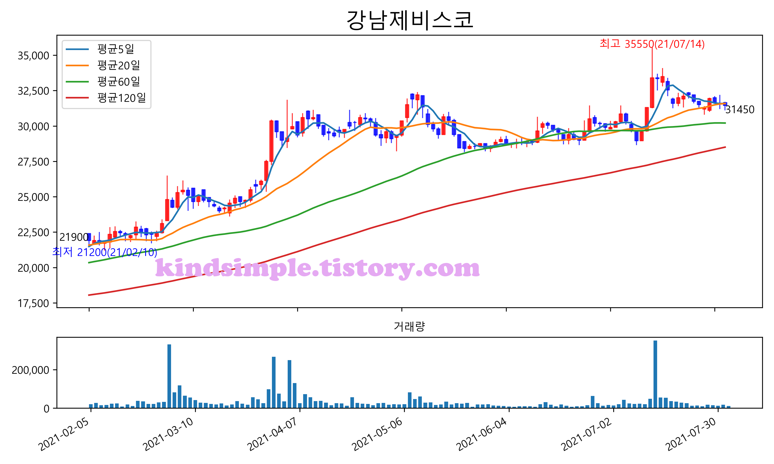 최근 6개월간 캔들차트 및 이동평균선입니다.