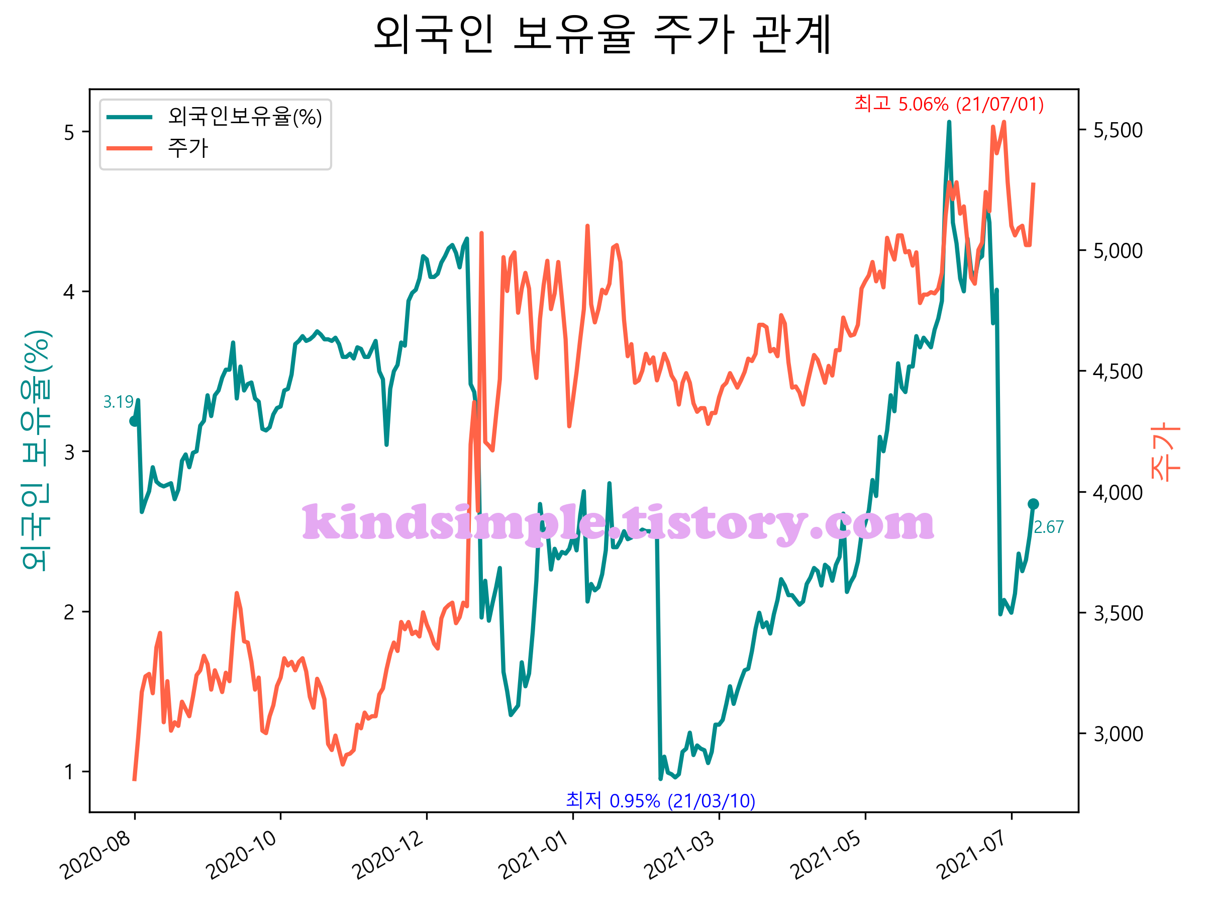 최근 1년간 외국인 보유율 및 주가와의 관계입니다.