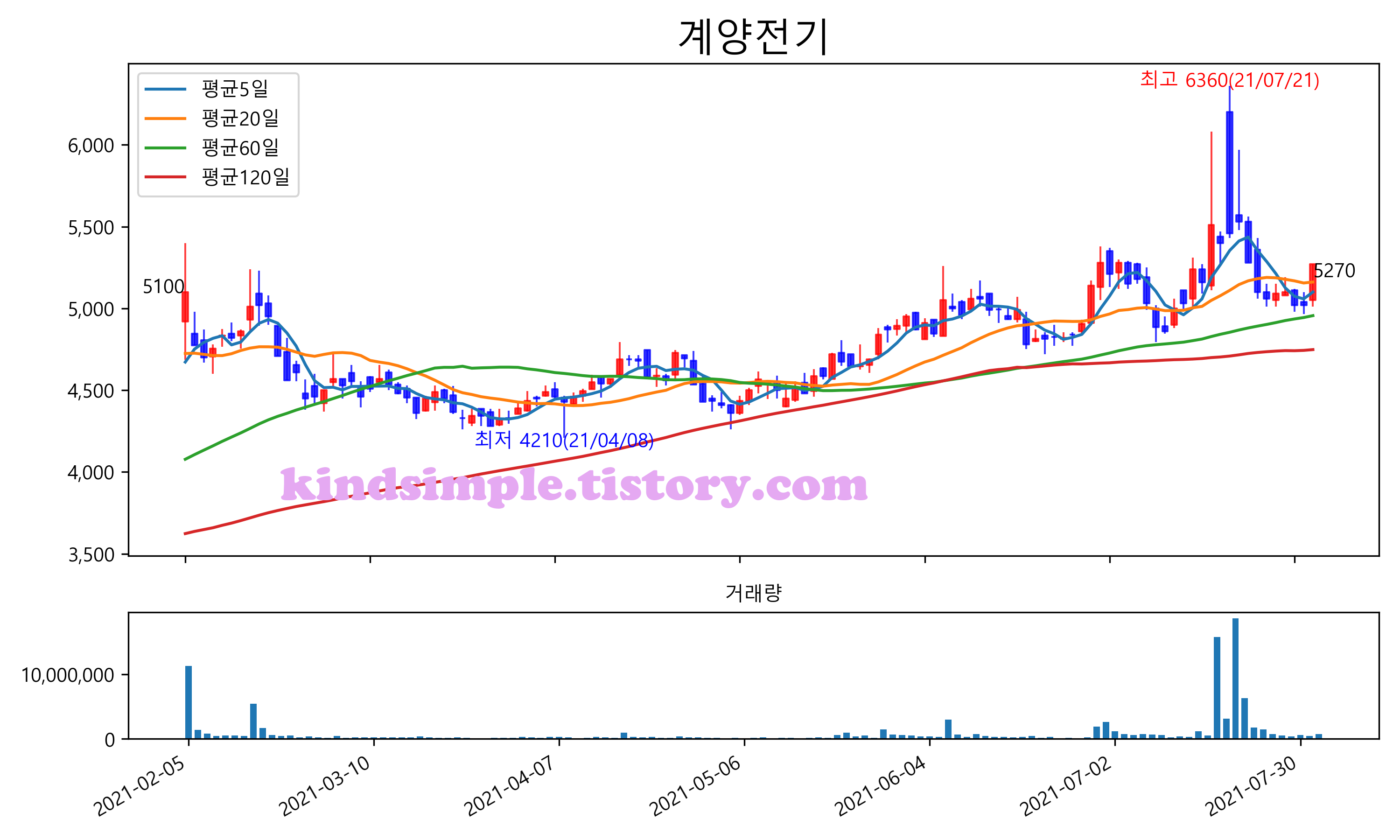 최근 6개월간 캔들차트 및 이동평균선입니다.