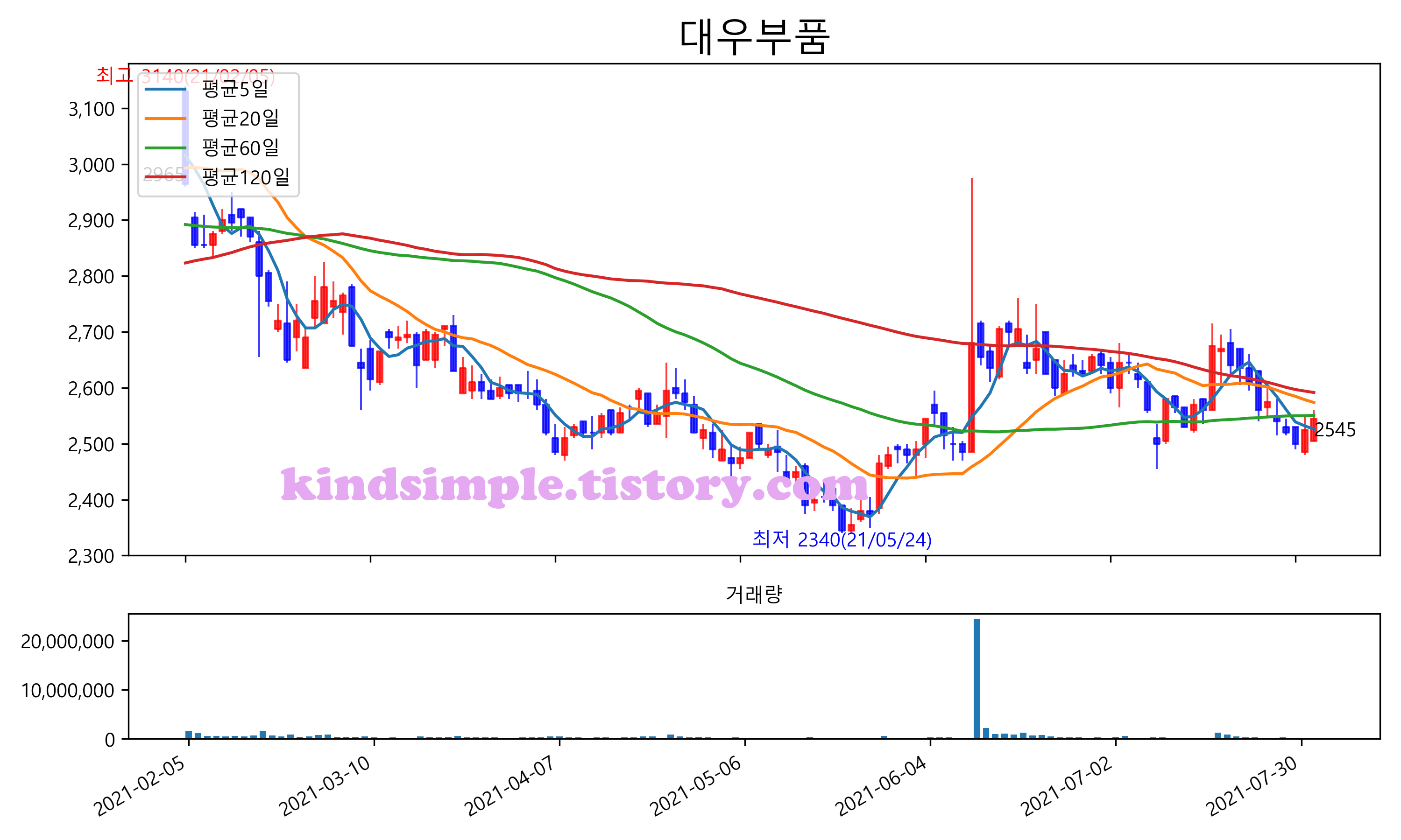 최근 6개월간 캔들차트 및 이동평균선입니다.