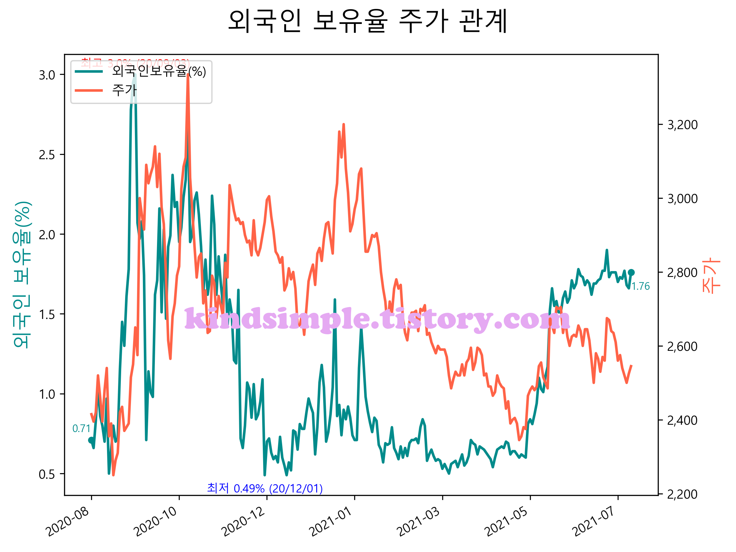 최근 1년간 외국인 보유율 및 주가와의 관계입니다.