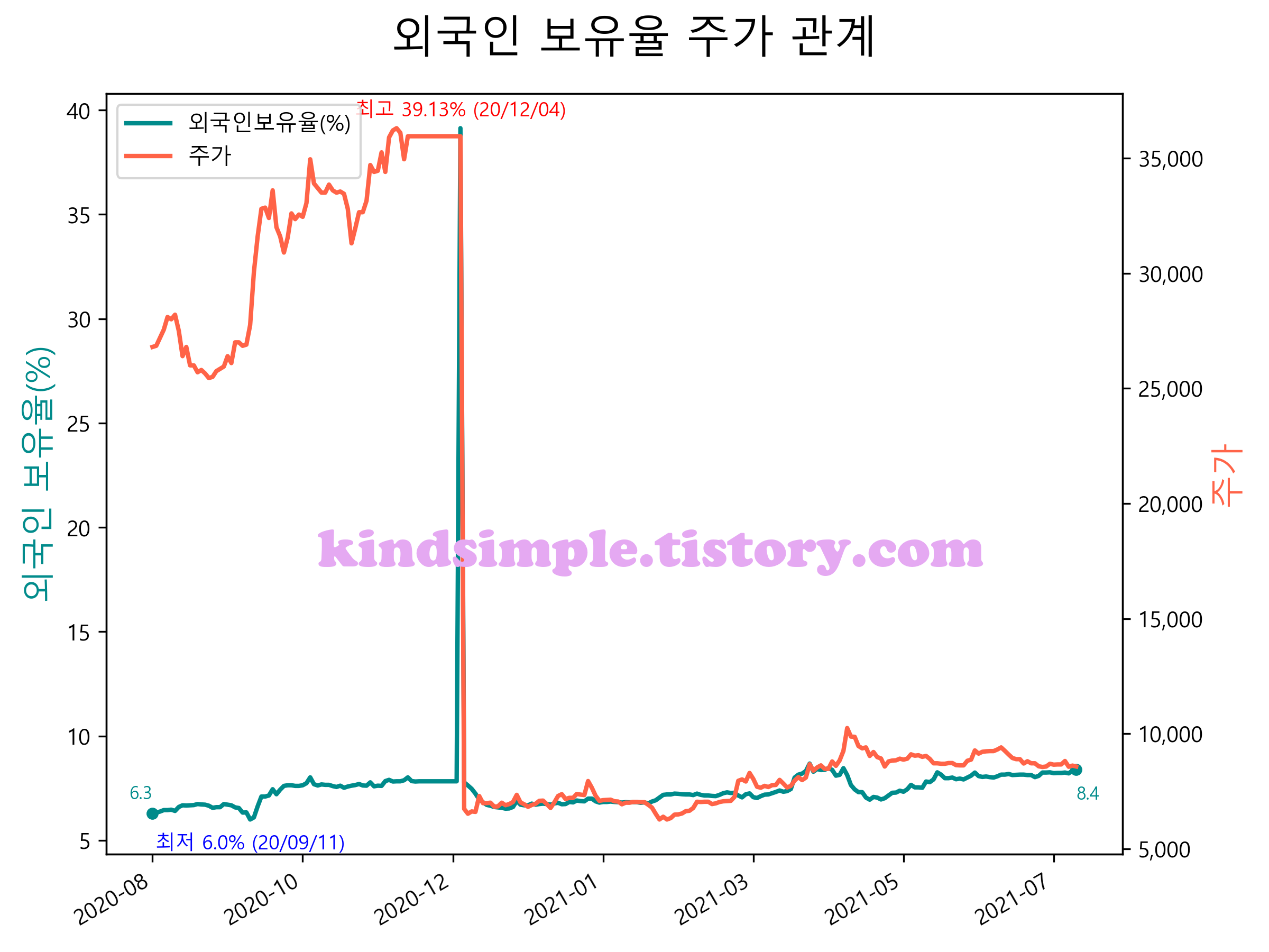 최근 1년간 외국인 보유율 및 주가와의 관계입니다.