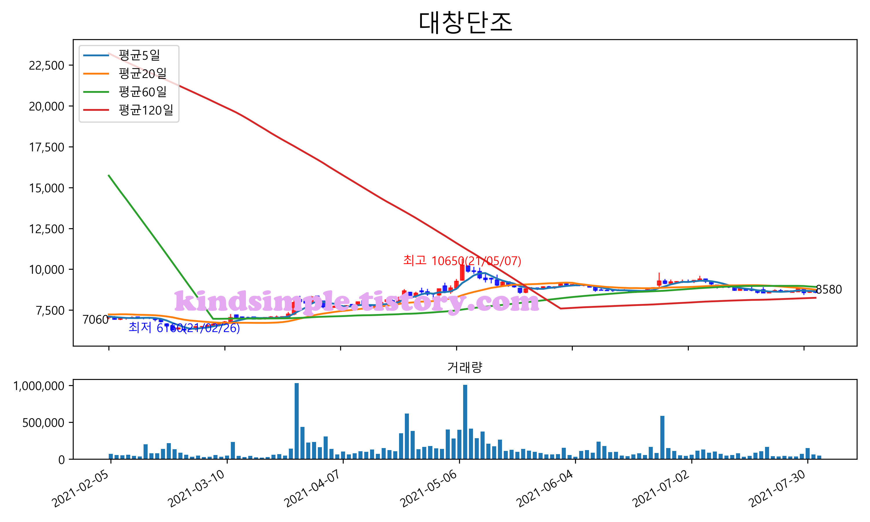 최근 6개월간 캔들차트 및 이동평균선입니다.