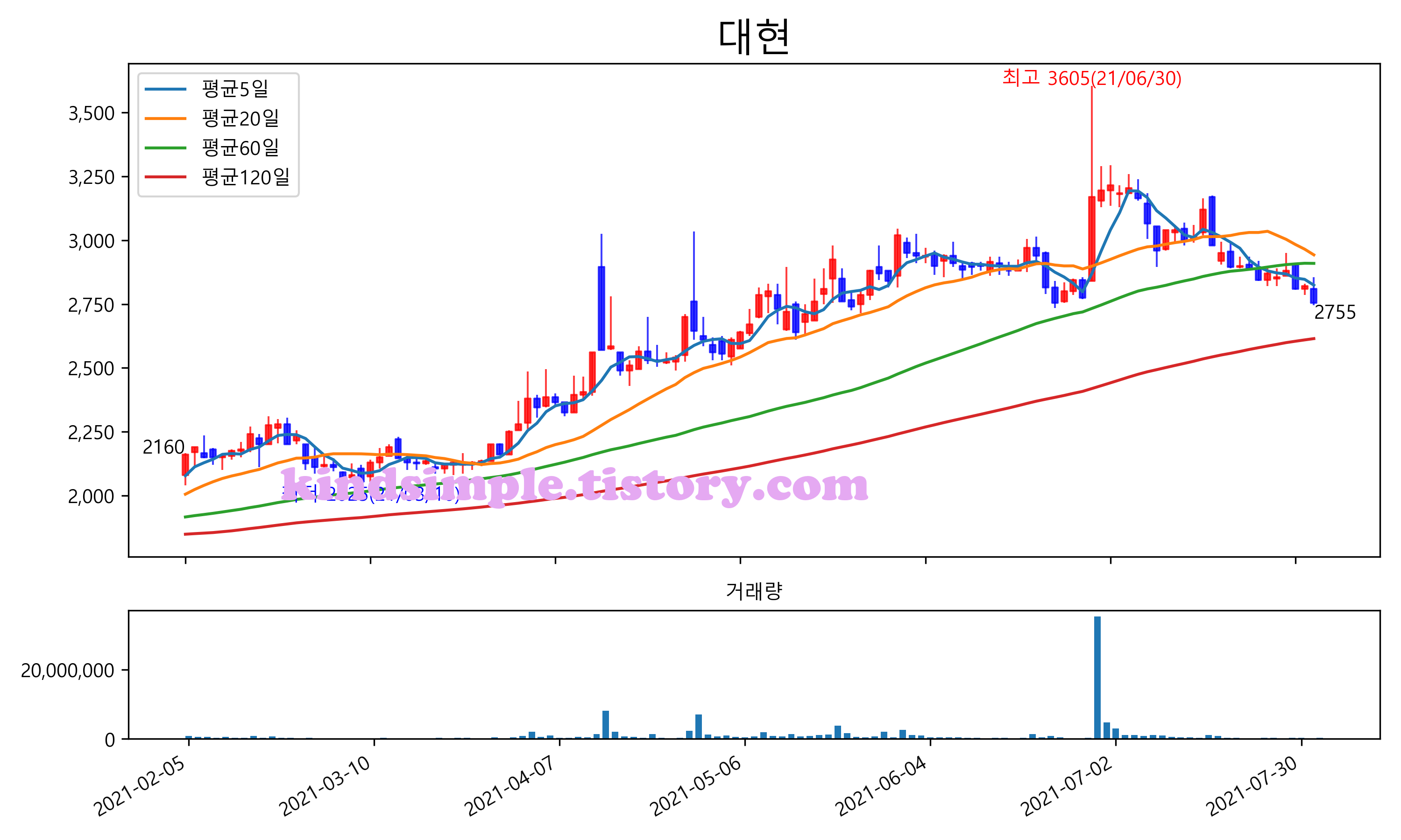 8월 4일 기준 주가는 2,755원 입니다. 아래는 최근 3년간의 주가흐름입니다.
