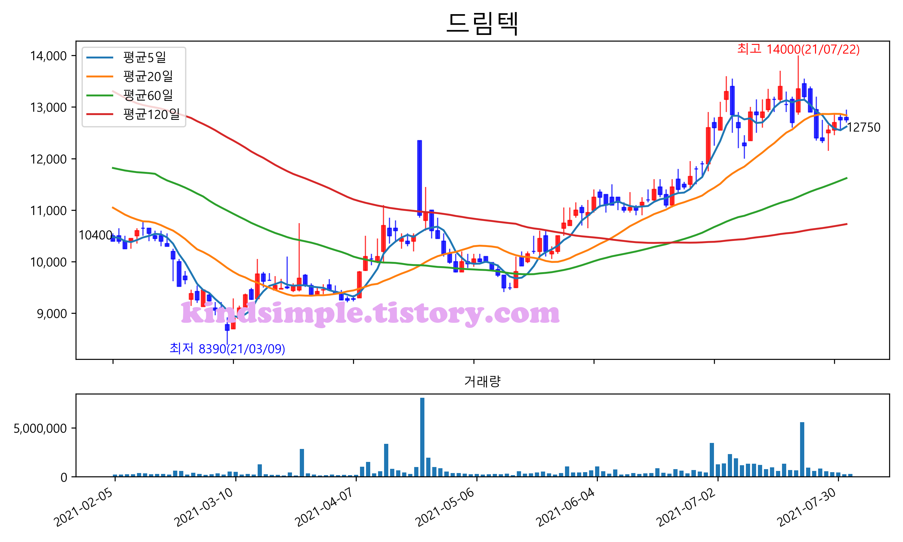 최근 6개월간 캔들차트 및 이동평균선입니다.