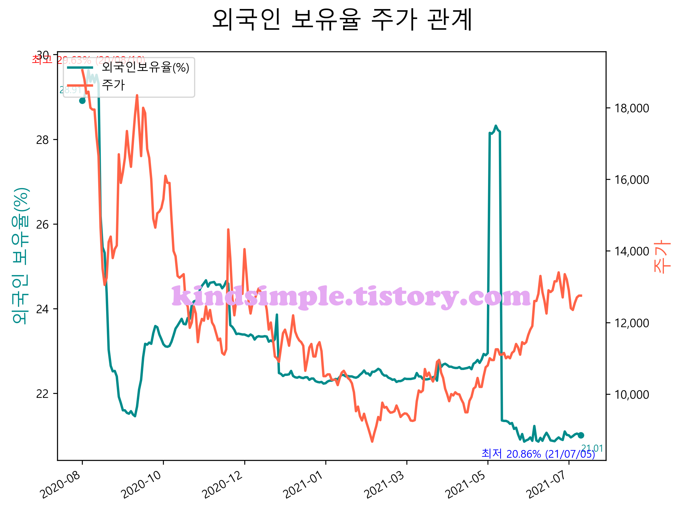 최근 1년간 외국인 보유율 및 주가와의 관계입니다.
