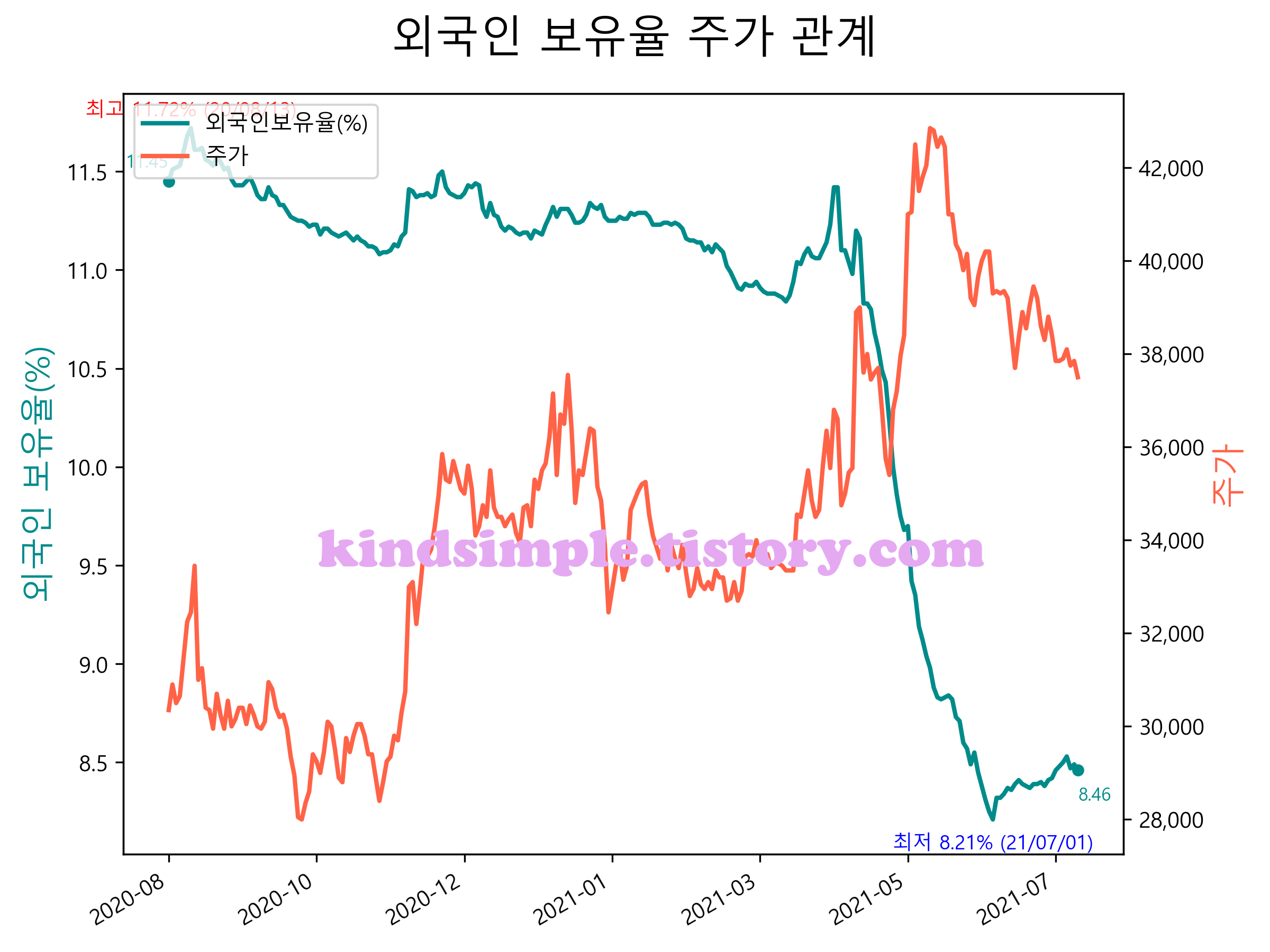 최근 1년간 외국인 보유율 및 주가와의 관계입니다.
