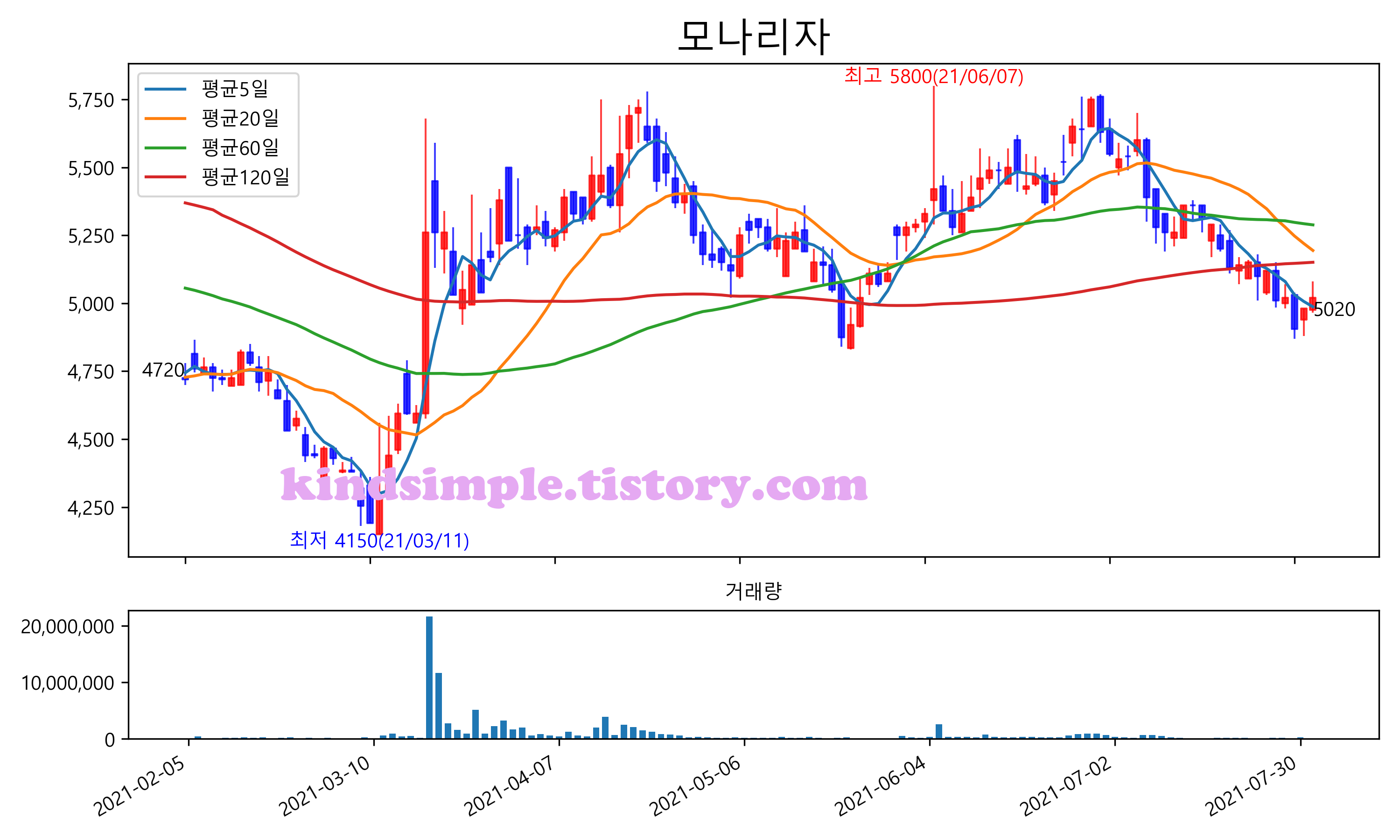 최근 6개월간 캔들차트 및 이동평균선입니다.
