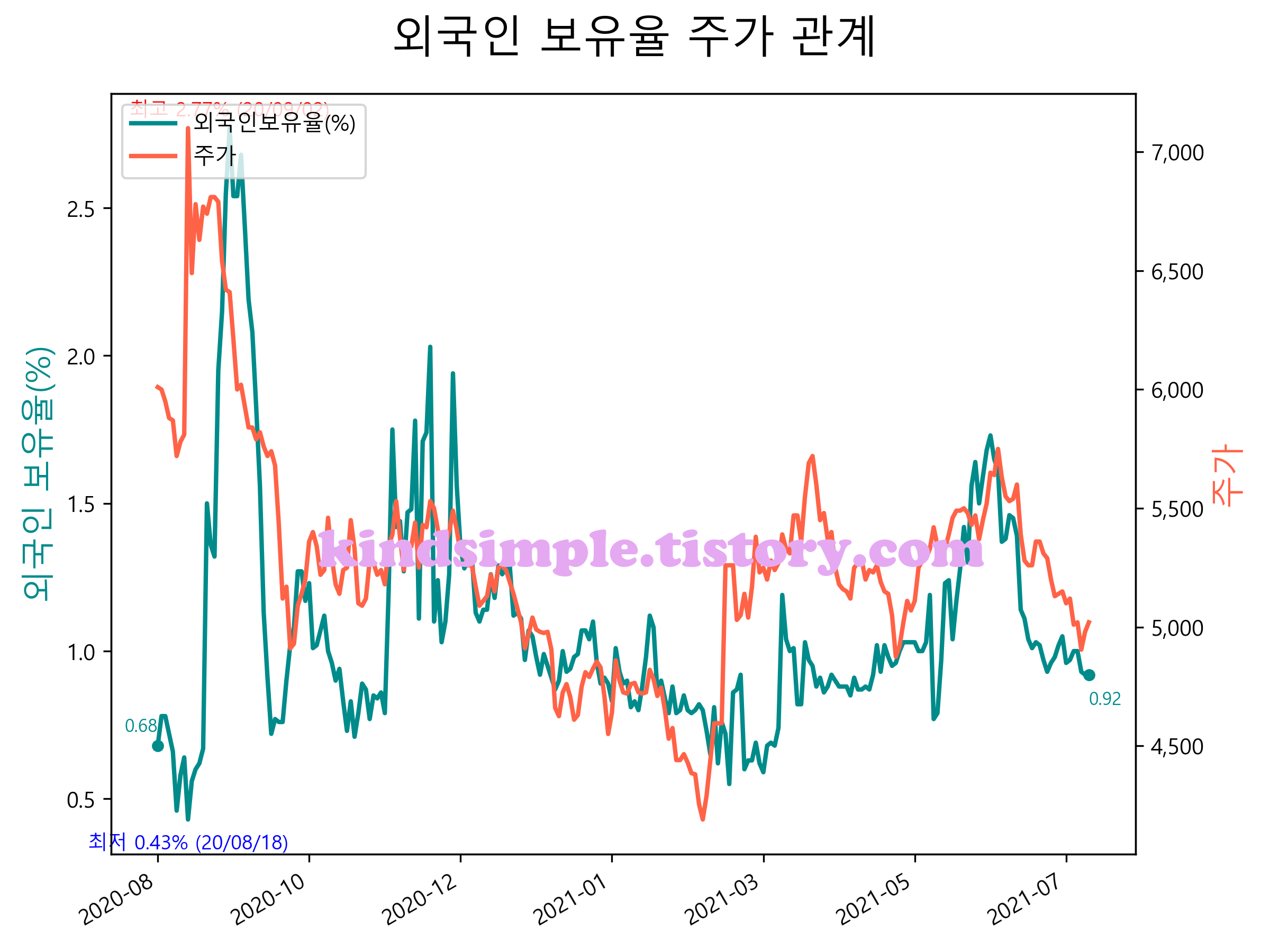 최근 1년간 외국인 보유율 및 주가와의 관계입니다.