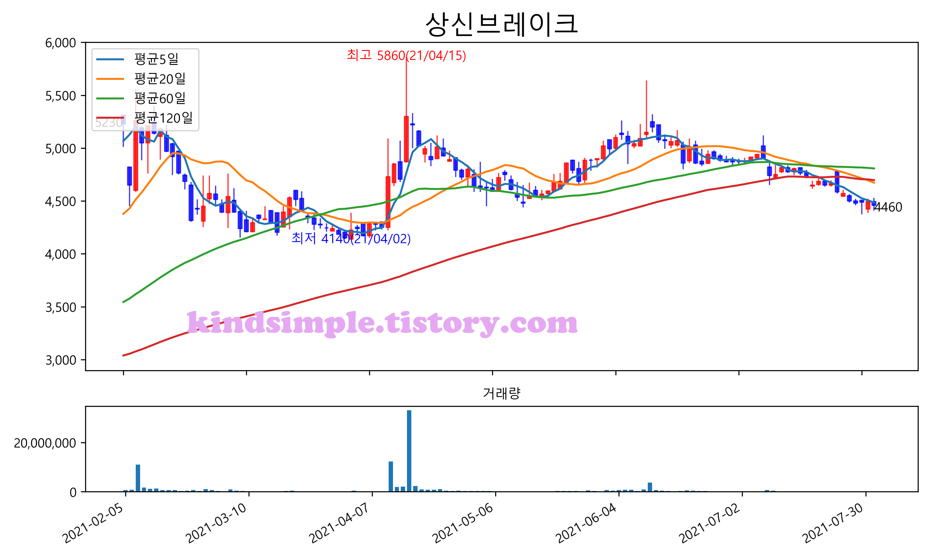 최근 6개월간 캔들차트 및 이동평균선입니다.