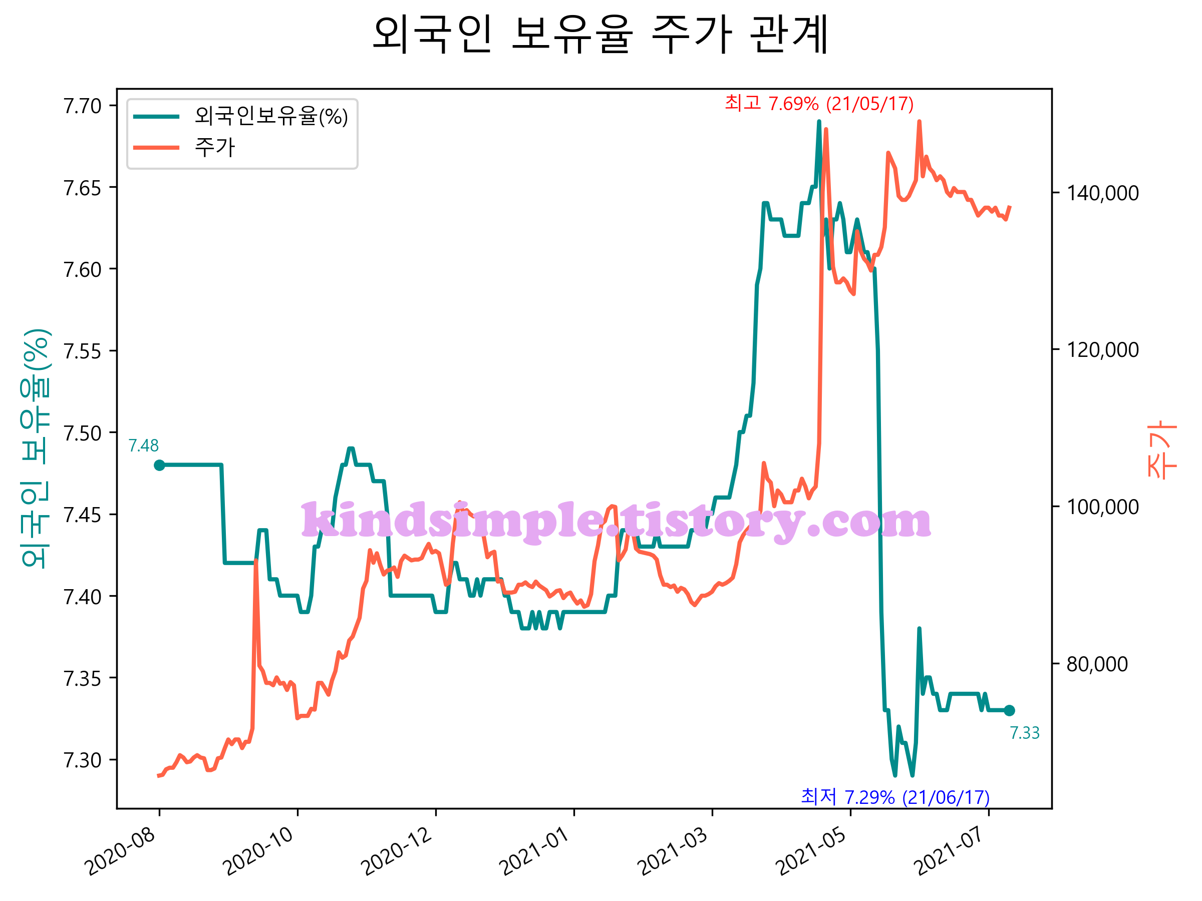 최근 1년간 외국인 보유율 및 주가와의 관계입니다.