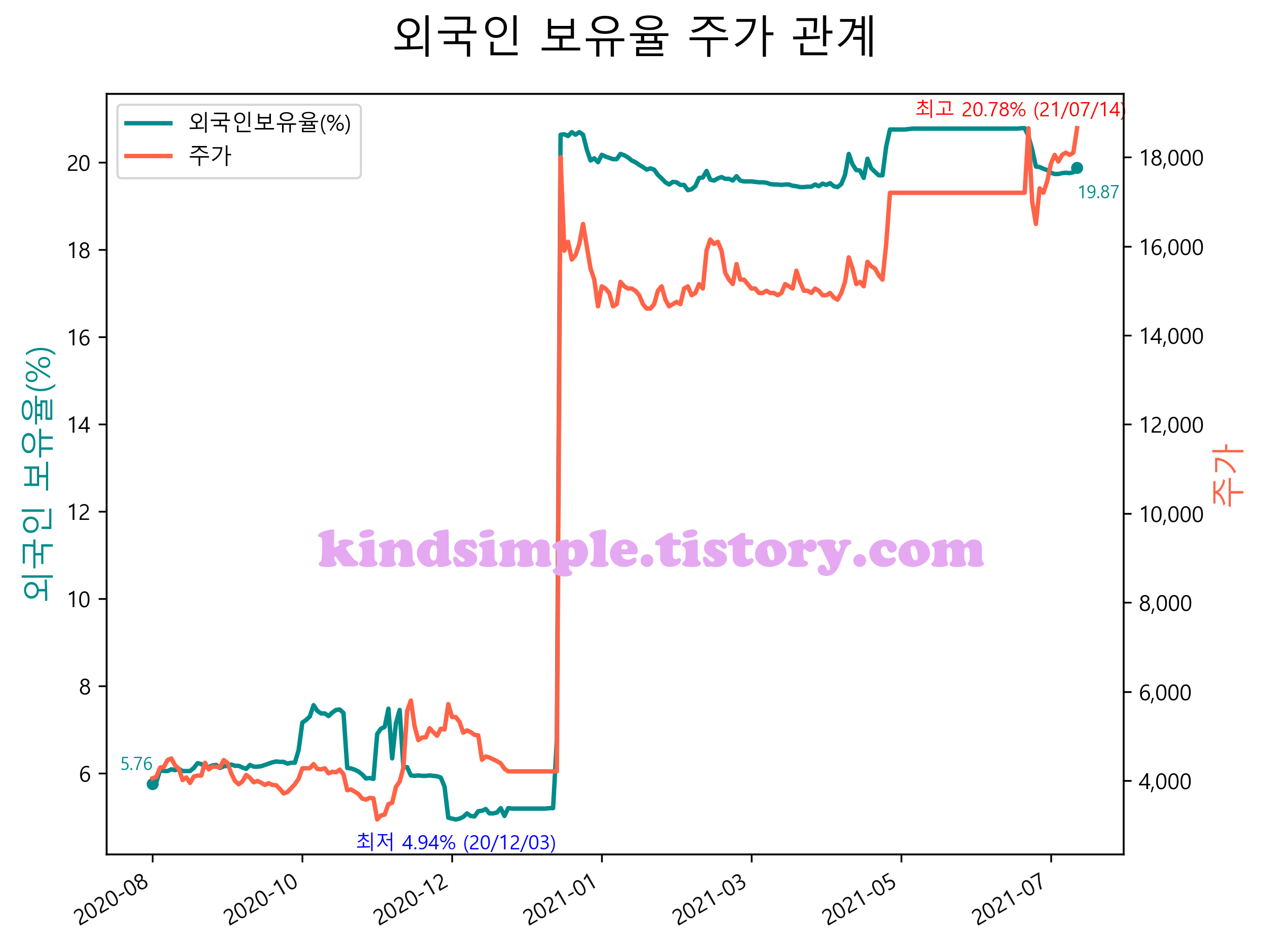 최근 1년간 외국인 보유율 및 주가와의 관계입니다.