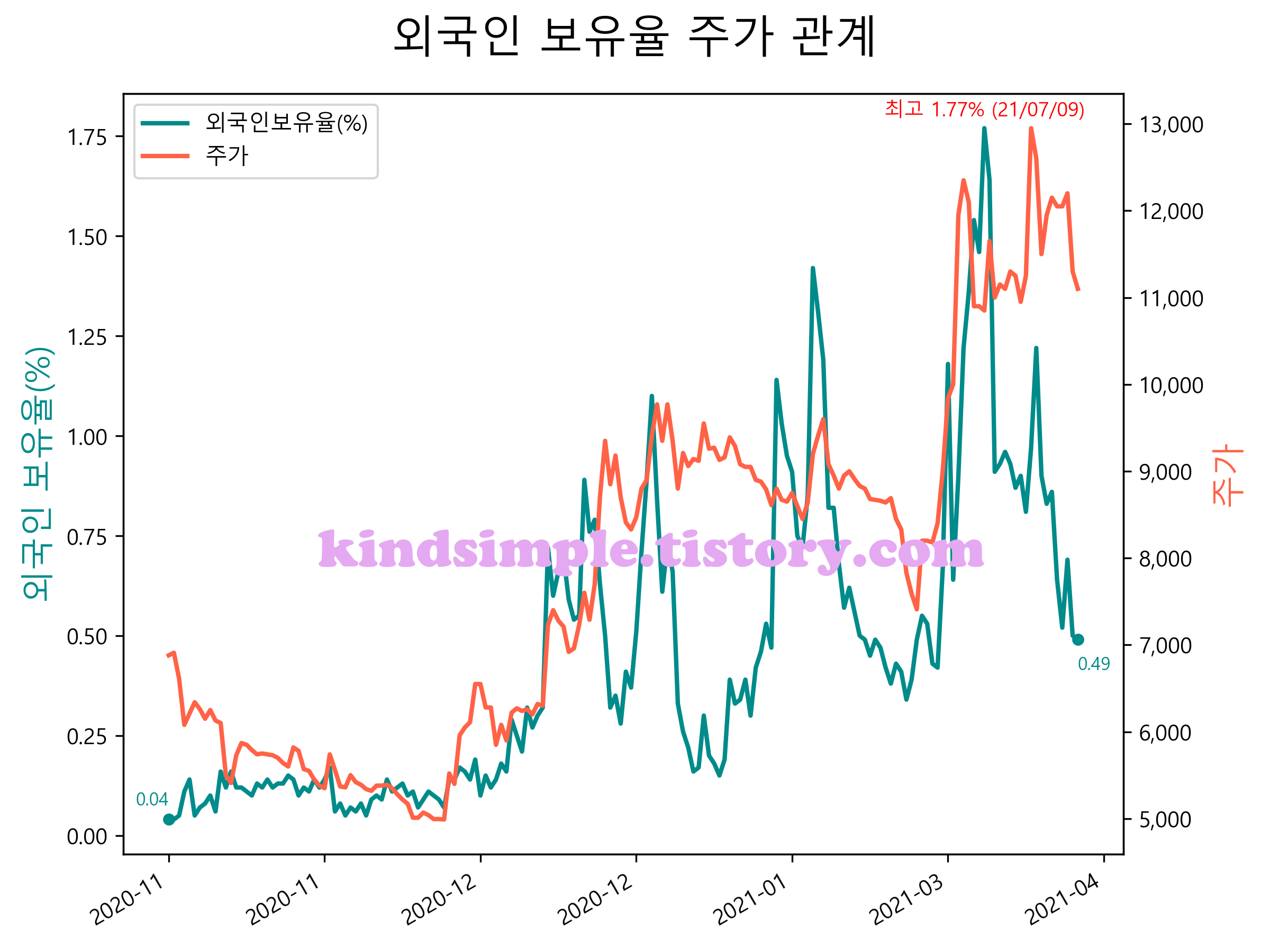 최근 1년간 외국인 보유율 및 주가와의 관계입니다.