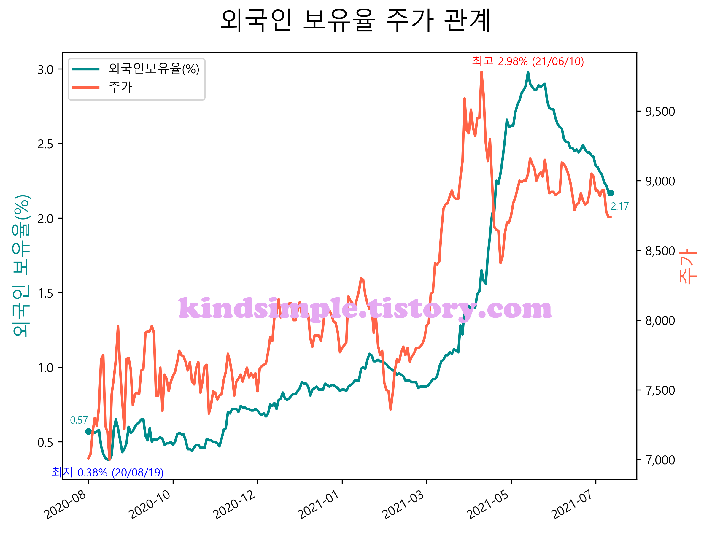 최근 1년간 외국인 보유율 및 주가와의 관계입니다.