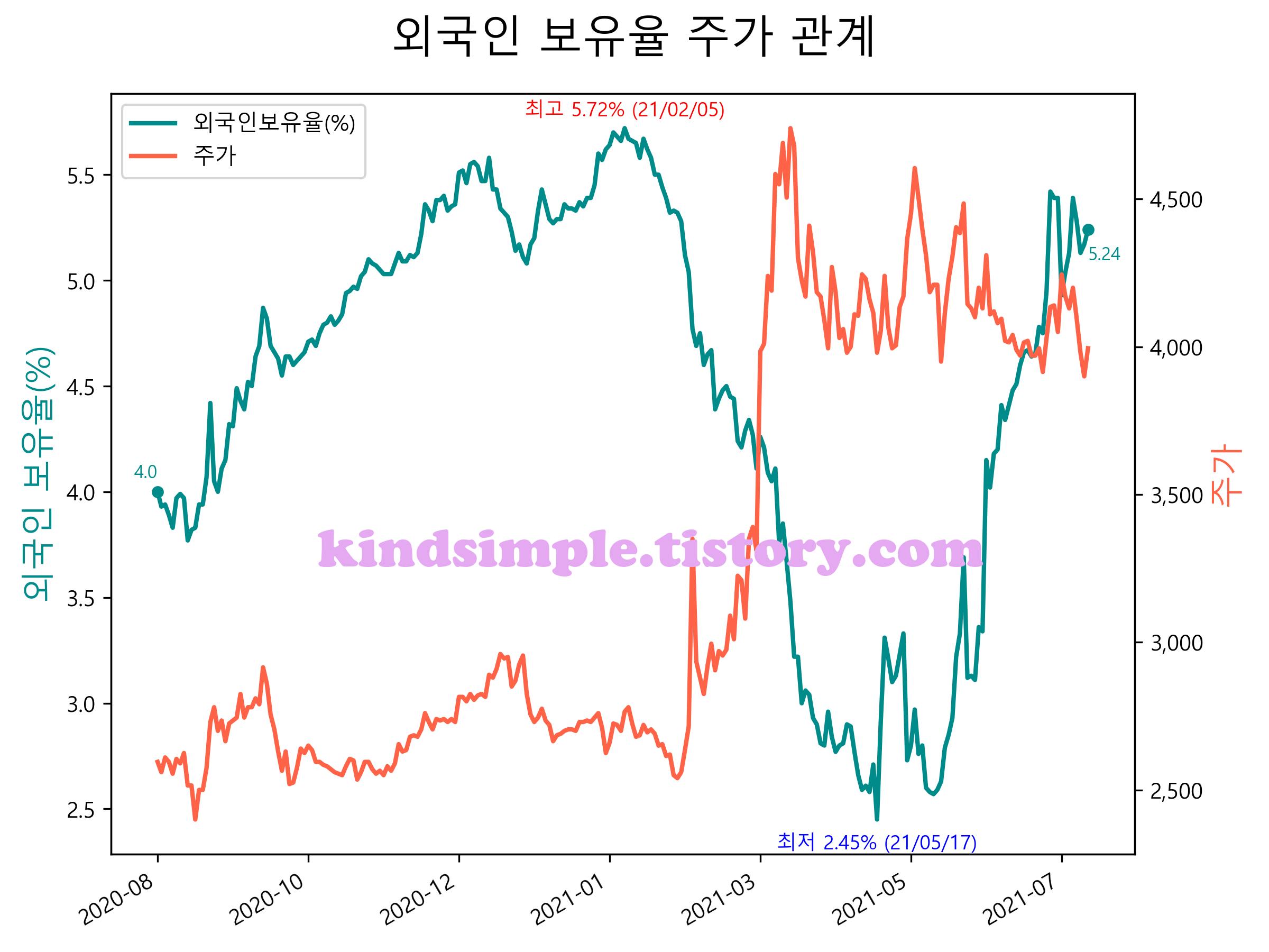 최근 1년간 외국인 보유율 및 주가와의 관계입니다.