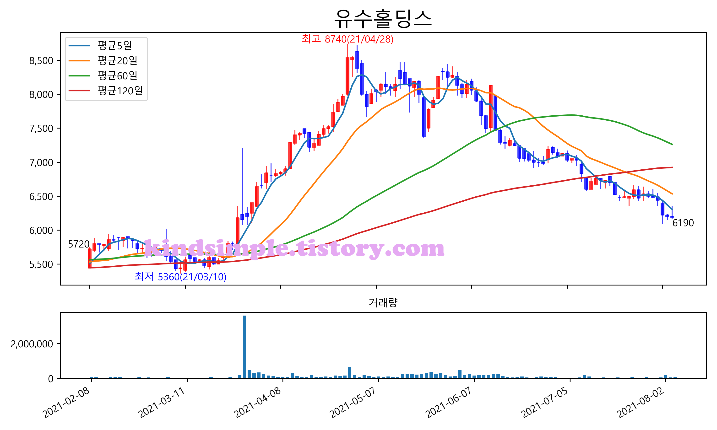 최근 6개월간 캔들차트 및 이동평균선입니다.