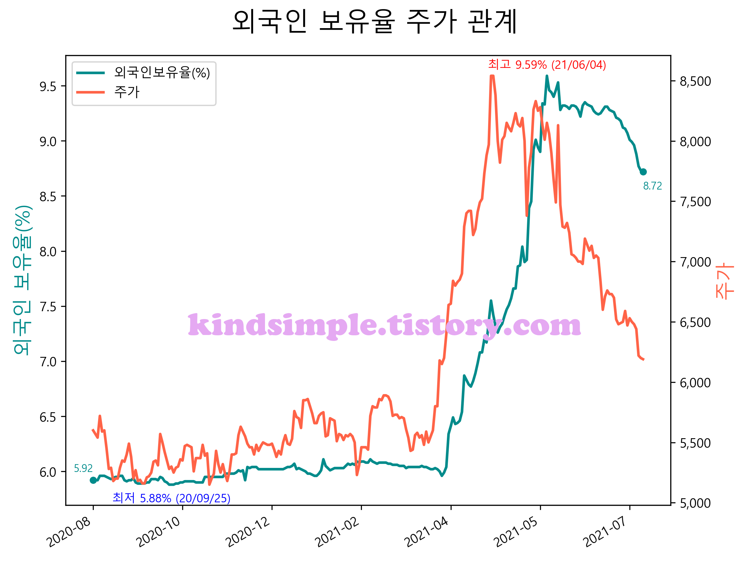 최근 1년간 외국인 보유율 및 주가와의 관계입니다.