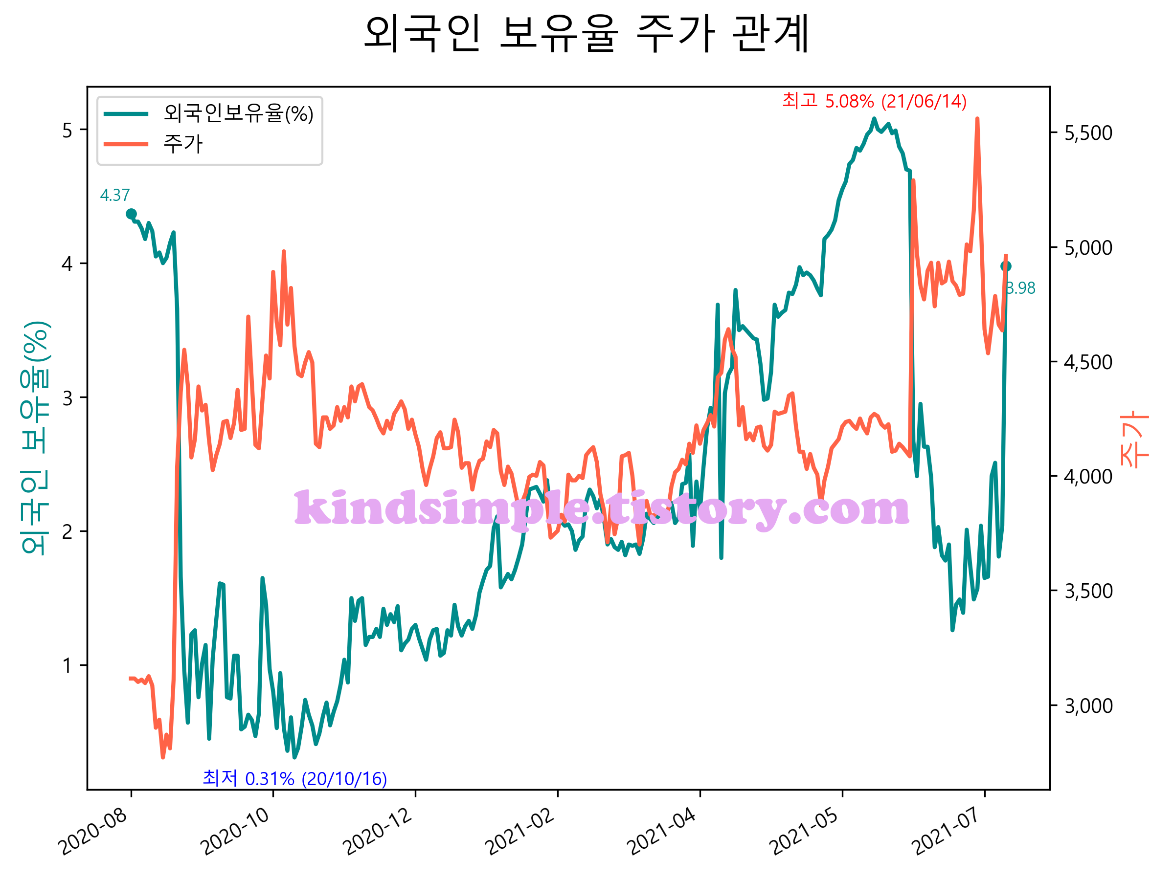 최근 1년간 외국인 보유율 및 주가와의 관계입니다.