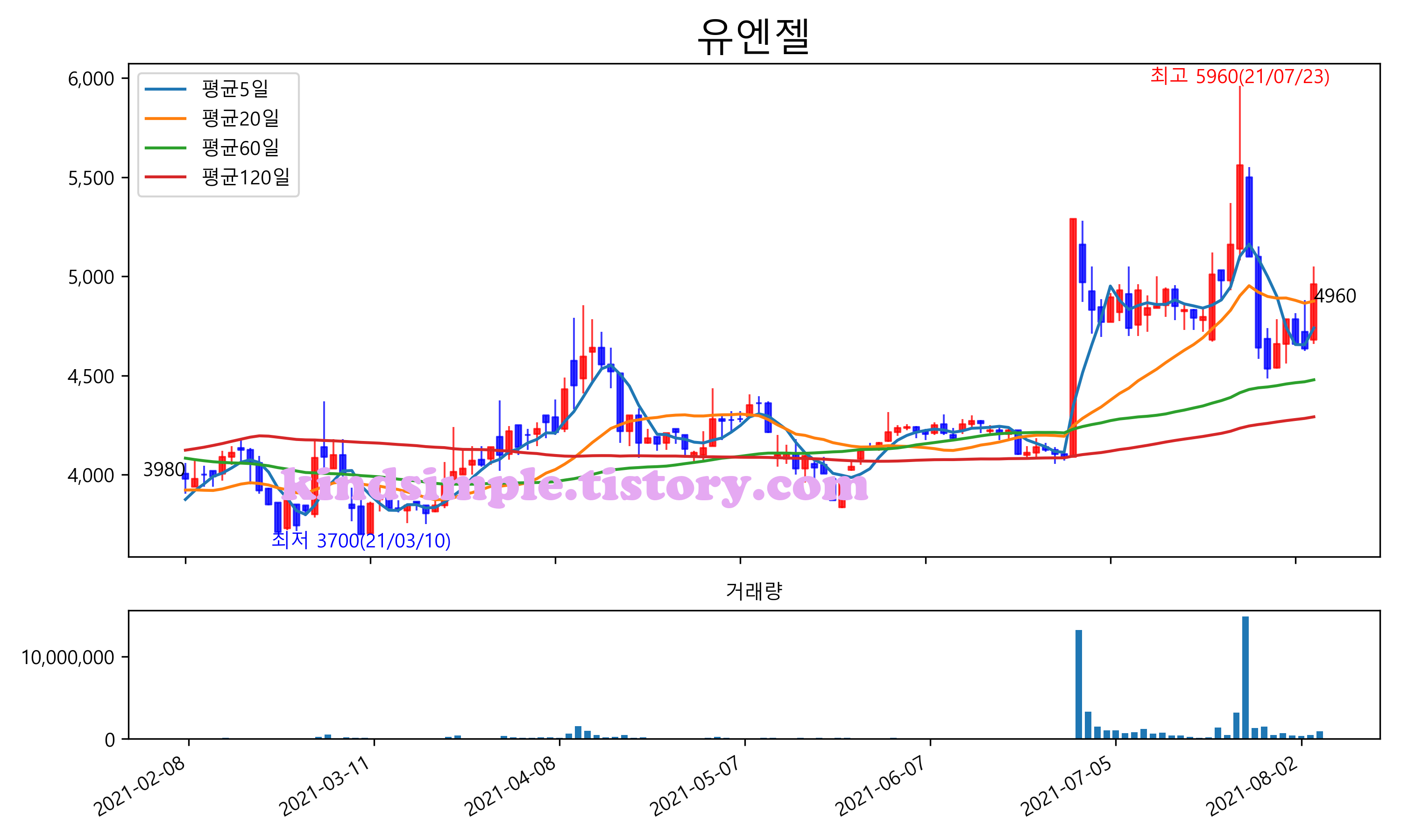 최근 6개월간 캔들차트 및 이동평균선입니다.