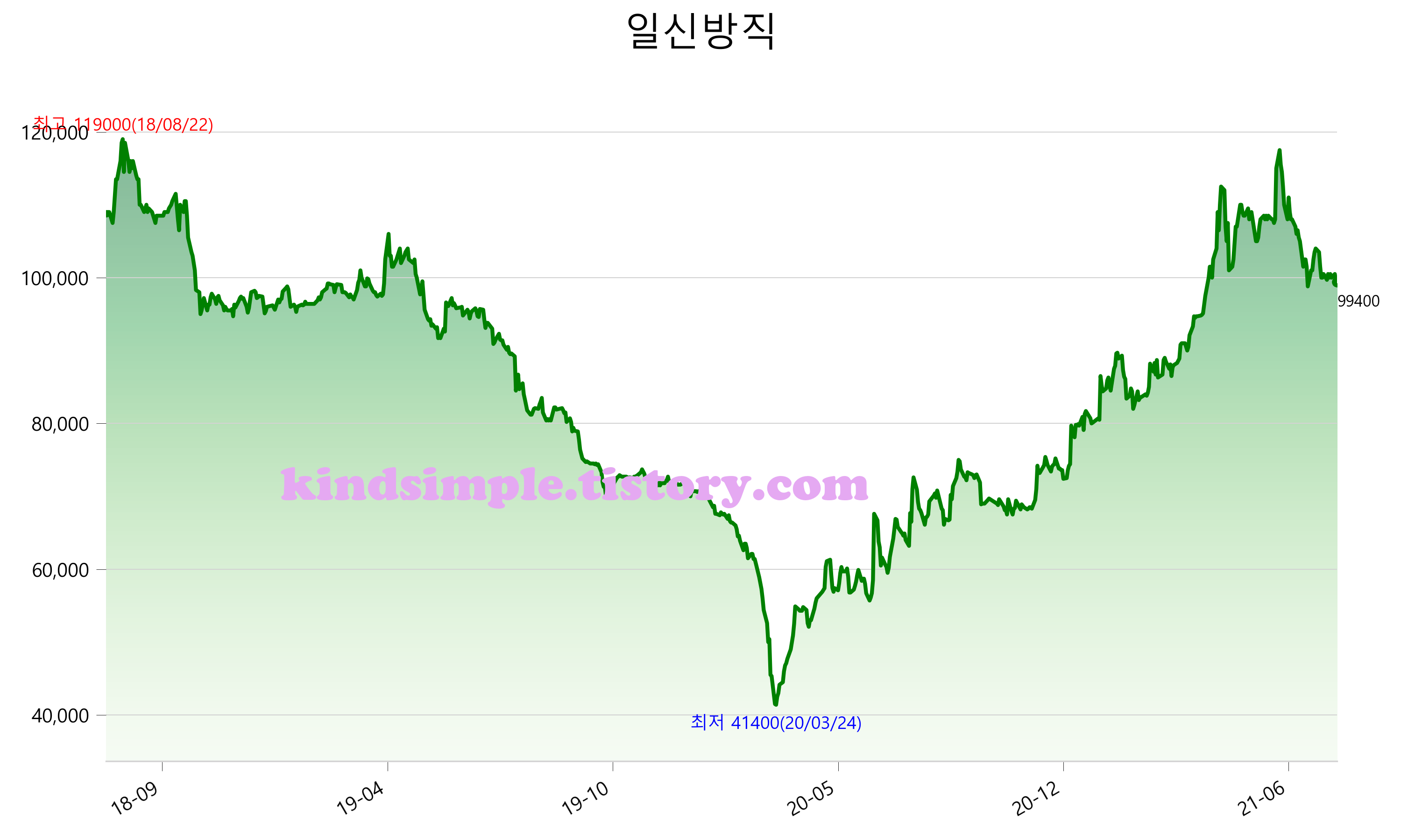 8월 5일 기준 주가는 99,400원 입니다. 아래는 최근 3년간의 주가흐름입니다.
