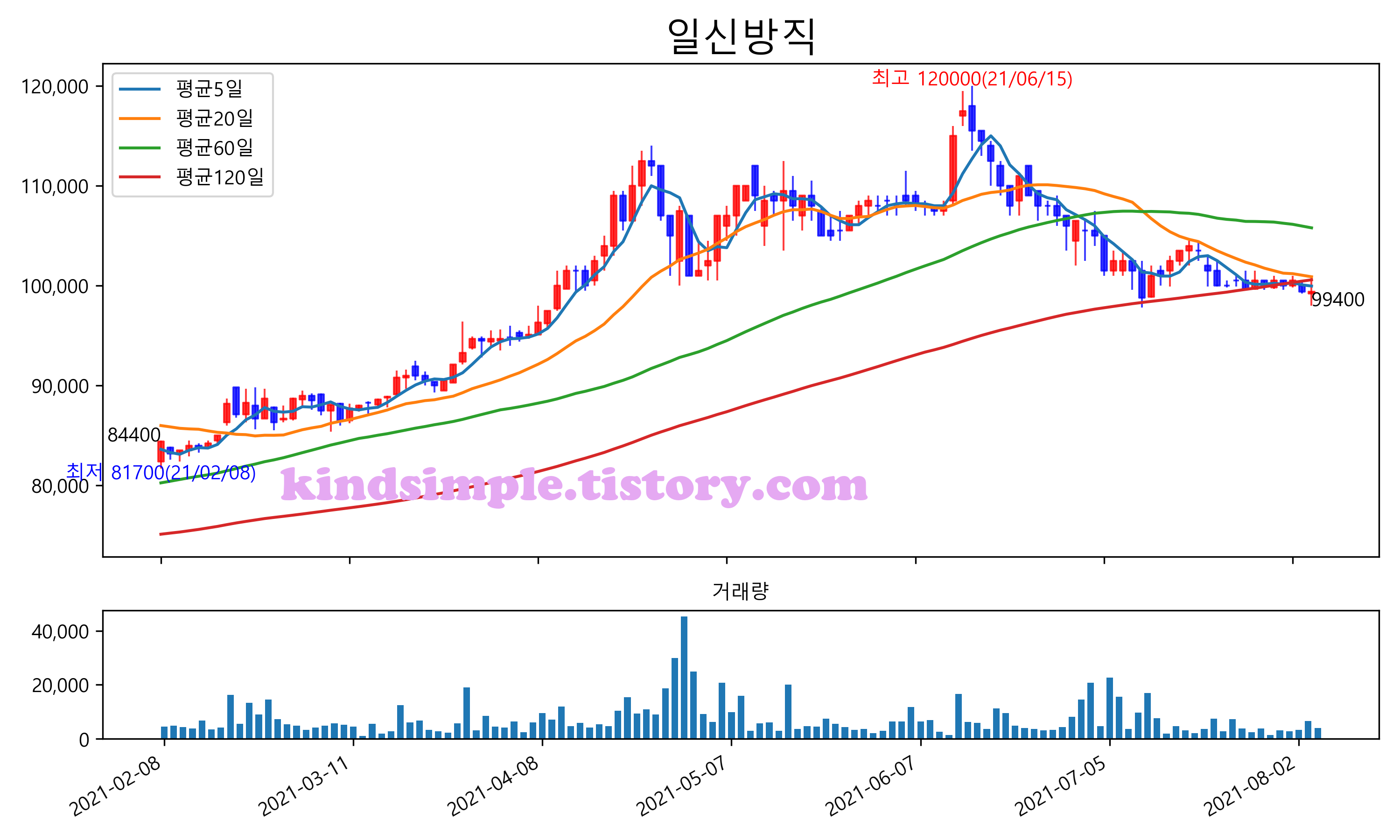 최근 6개월간 캔들차트 및 이동평균선입니다.