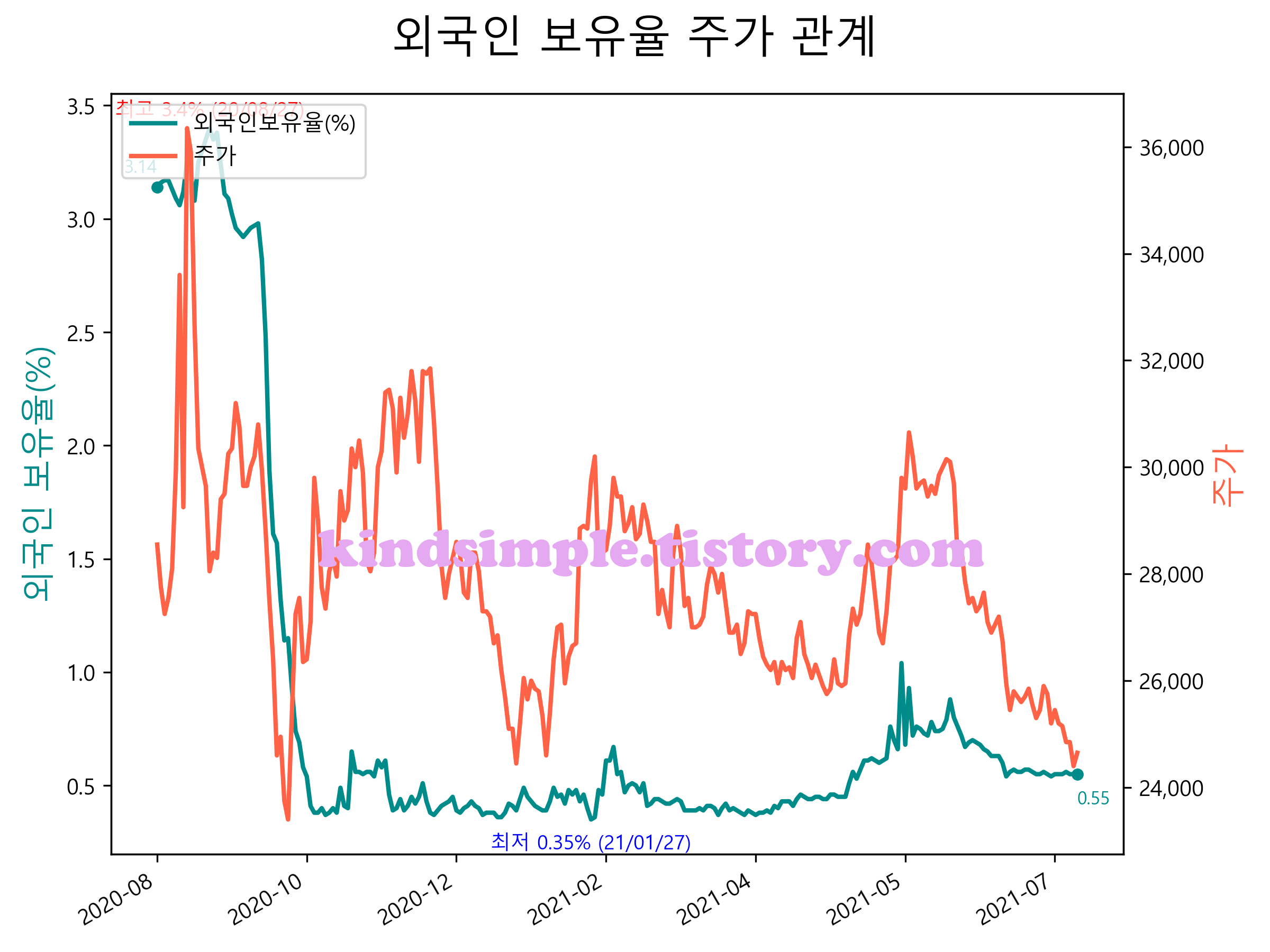 최근 1년간 외국인 보유율 및 주가와의 관계입니다.