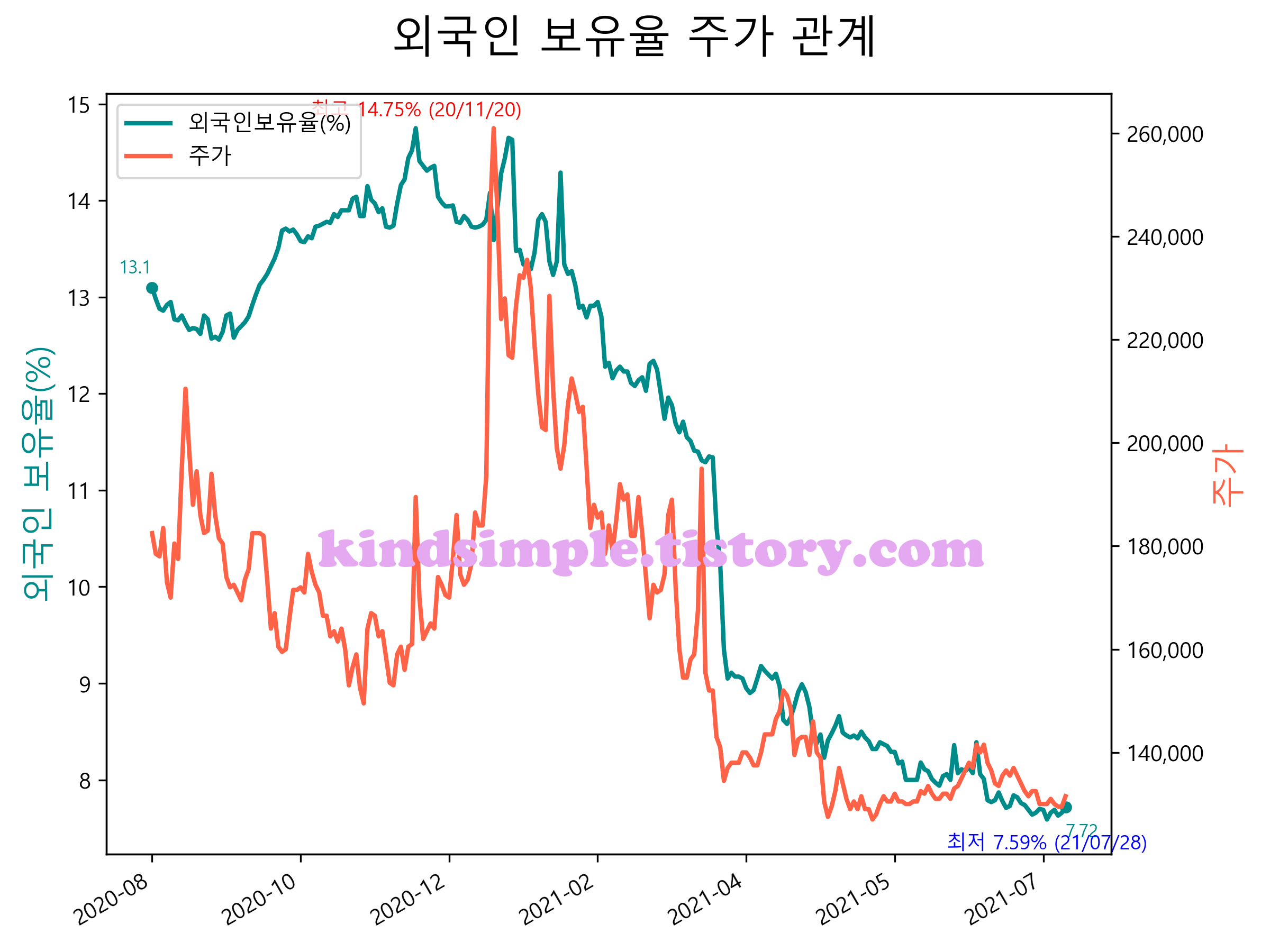 최근 1년간 외국인 보유율 및 주가와의 관계입니다.