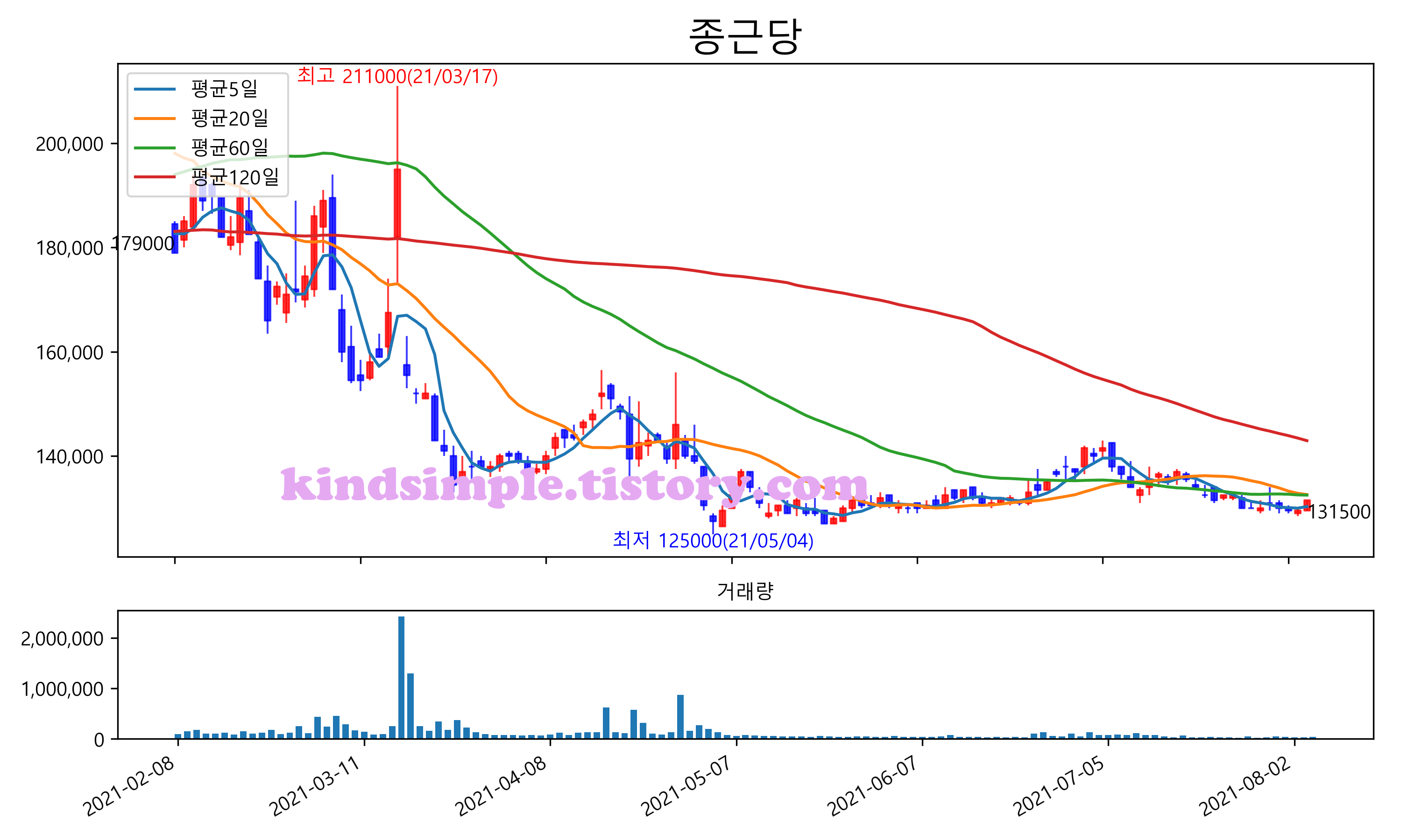 최근 6개월간 캔들차트 및 이동평균선입니다.