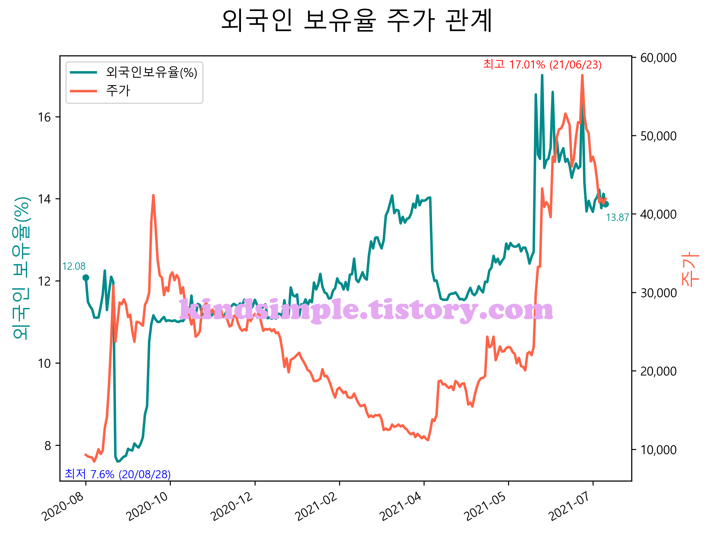 최근 1년간 외국인 보유율 및 주가와의 관계입니다.