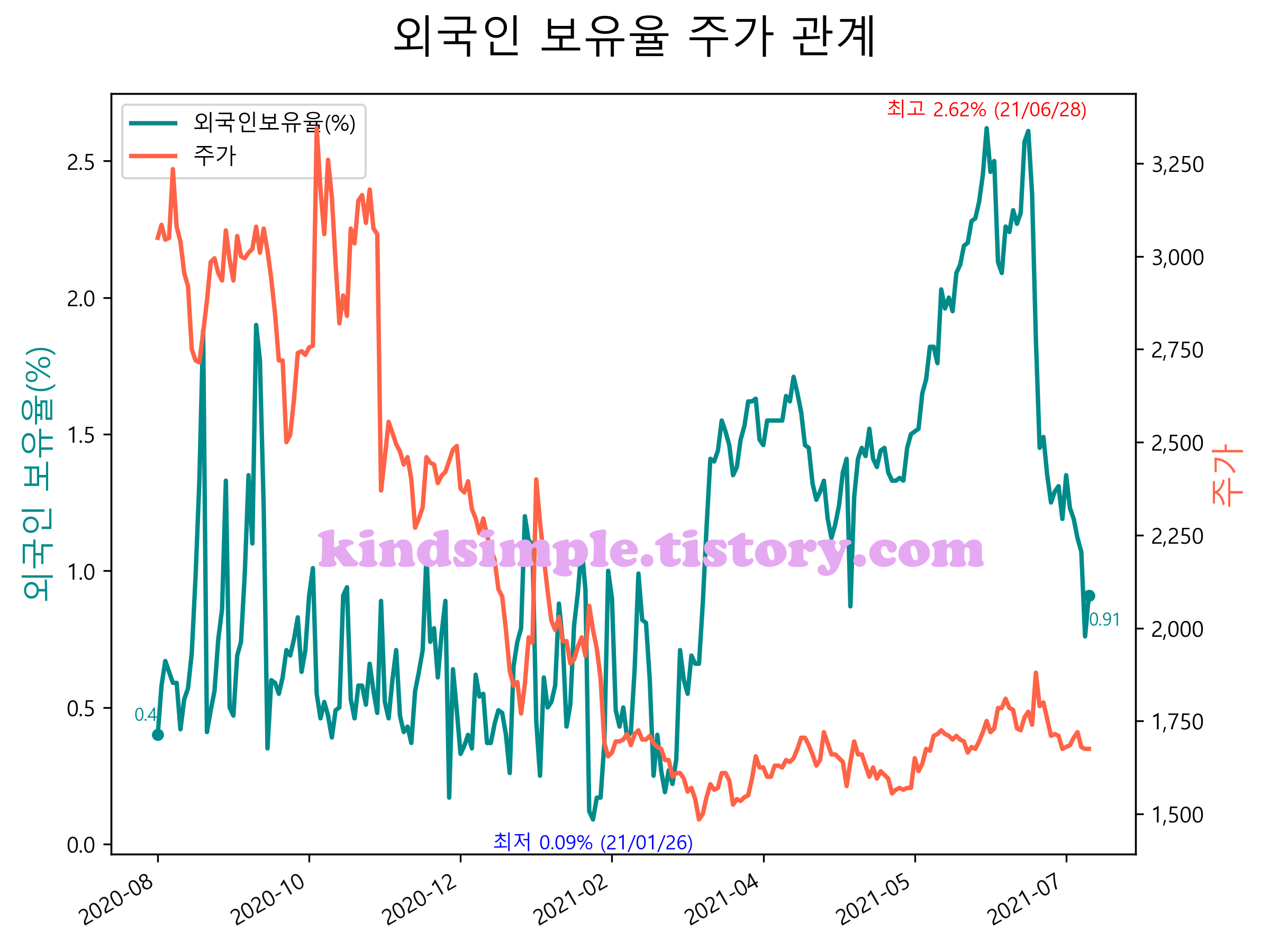 최근 1년간 외국인 보유율 및 주가와의 관계입니다.