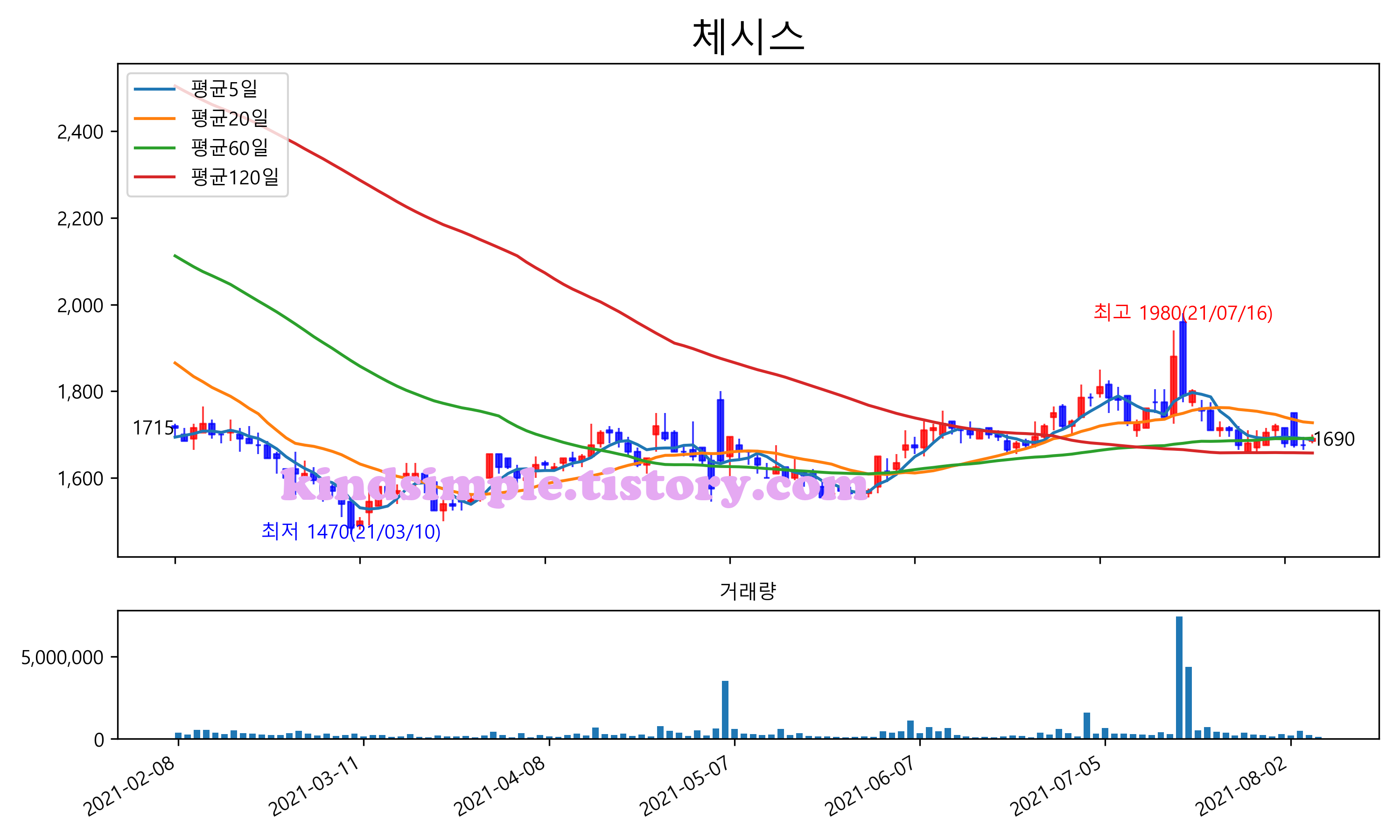 최근 6개월간 캔들차트 및 이동평균선입니다.