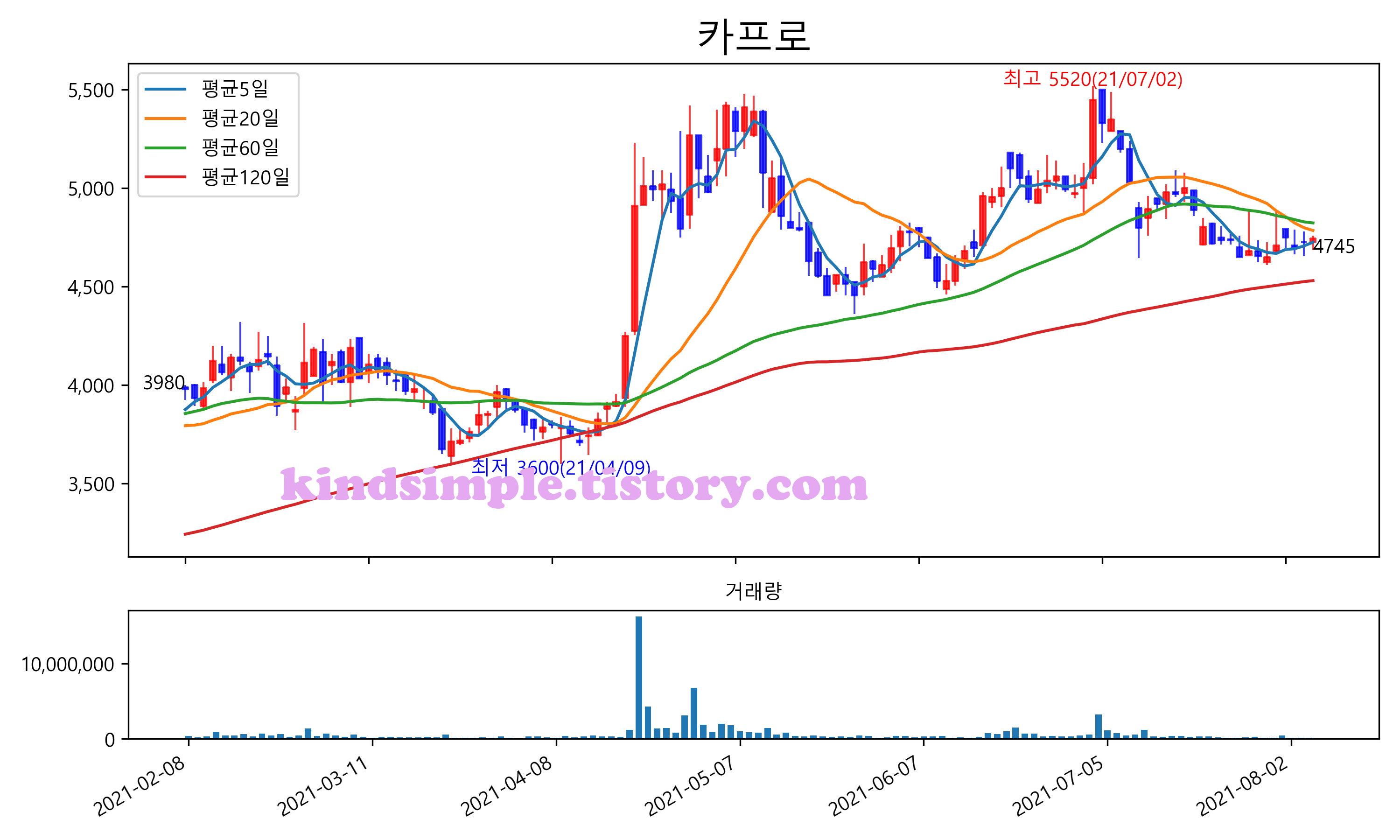 최근 6개월간 캔들차트 및 이동평균선입니다.