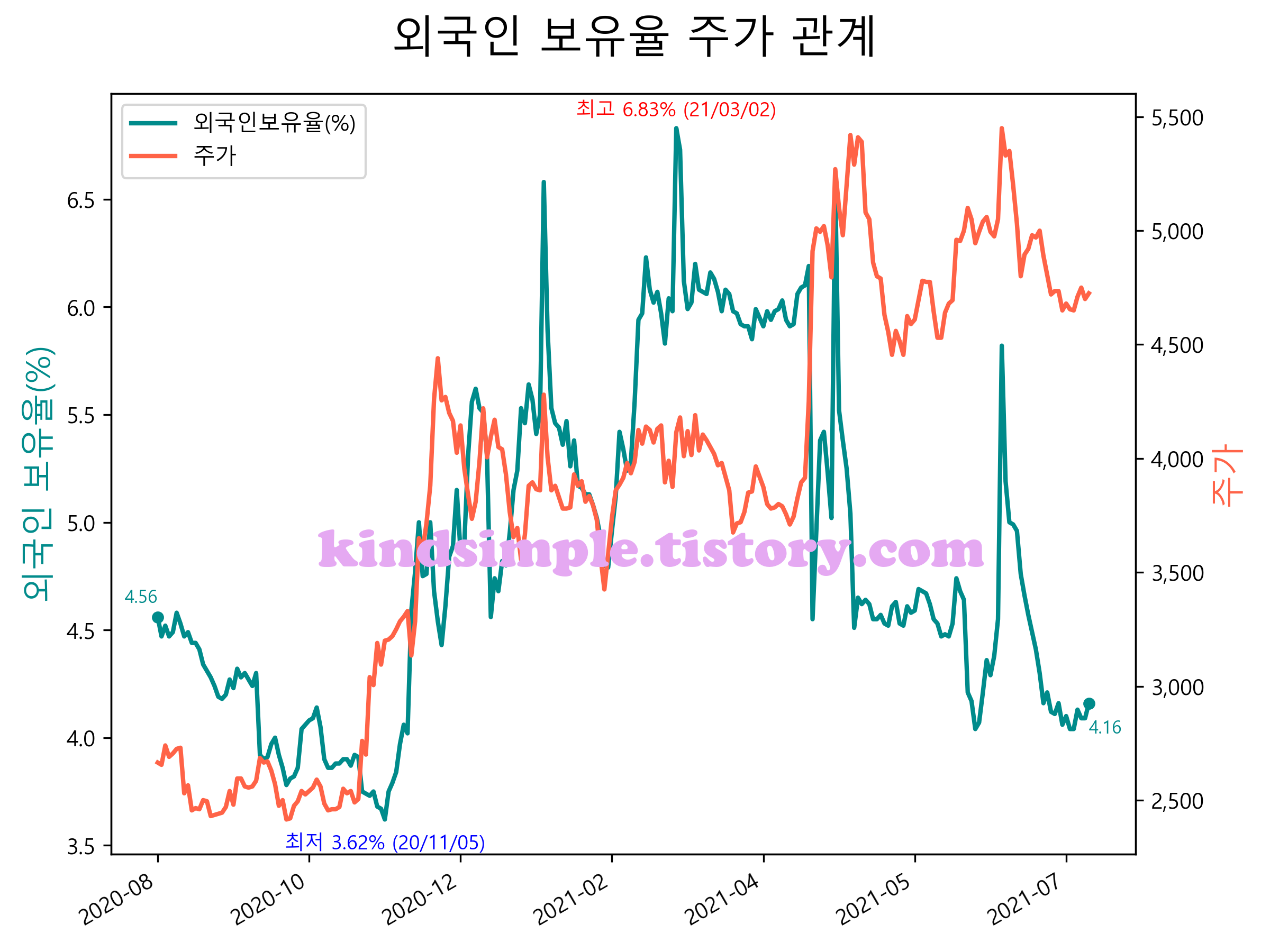 최근 1년간 외국인 보유율 및 주가와의 관계입니다.