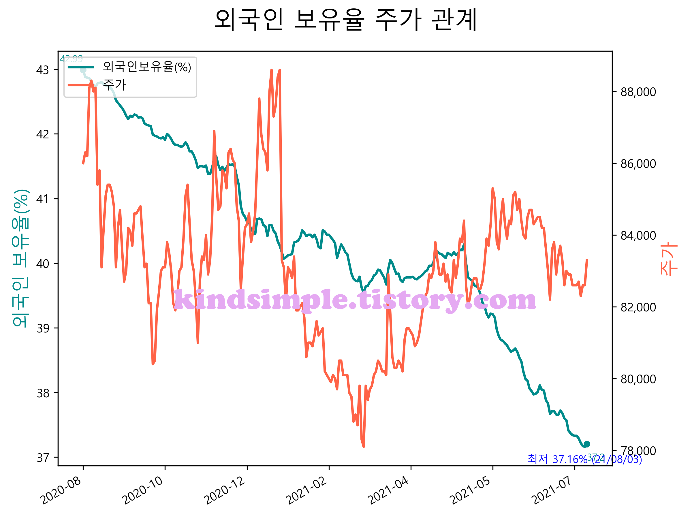 최근 1년간 외국인 보유율 및 주가와의 관계입니다.