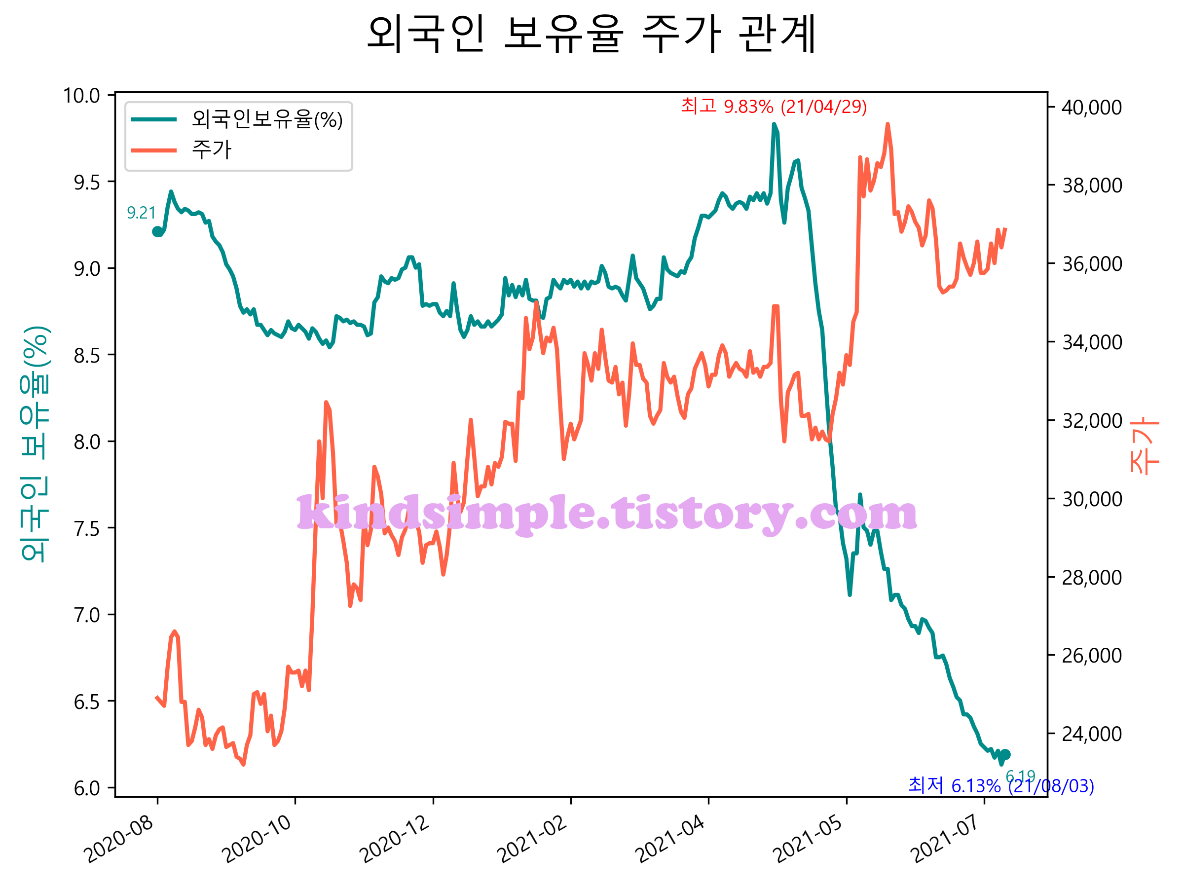 최근 1년간 외국인 보유율 및 주가와의 관계입니다.
