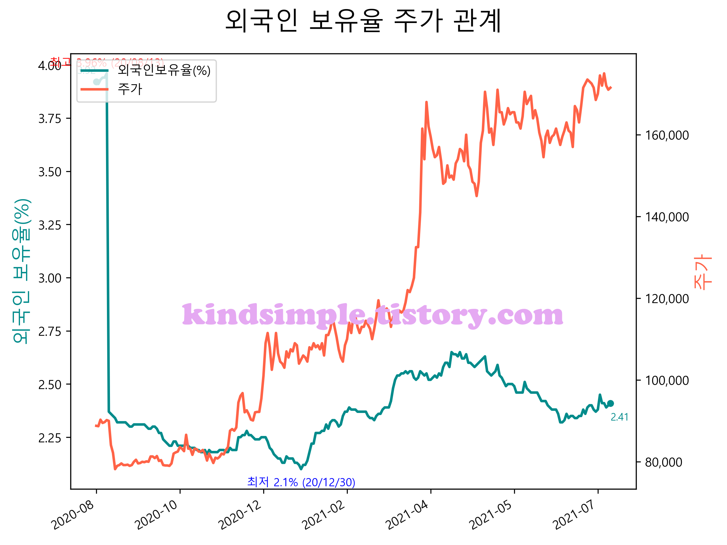 최근 1년간 외국인 보유율 및 주가와의 관계입니다.
