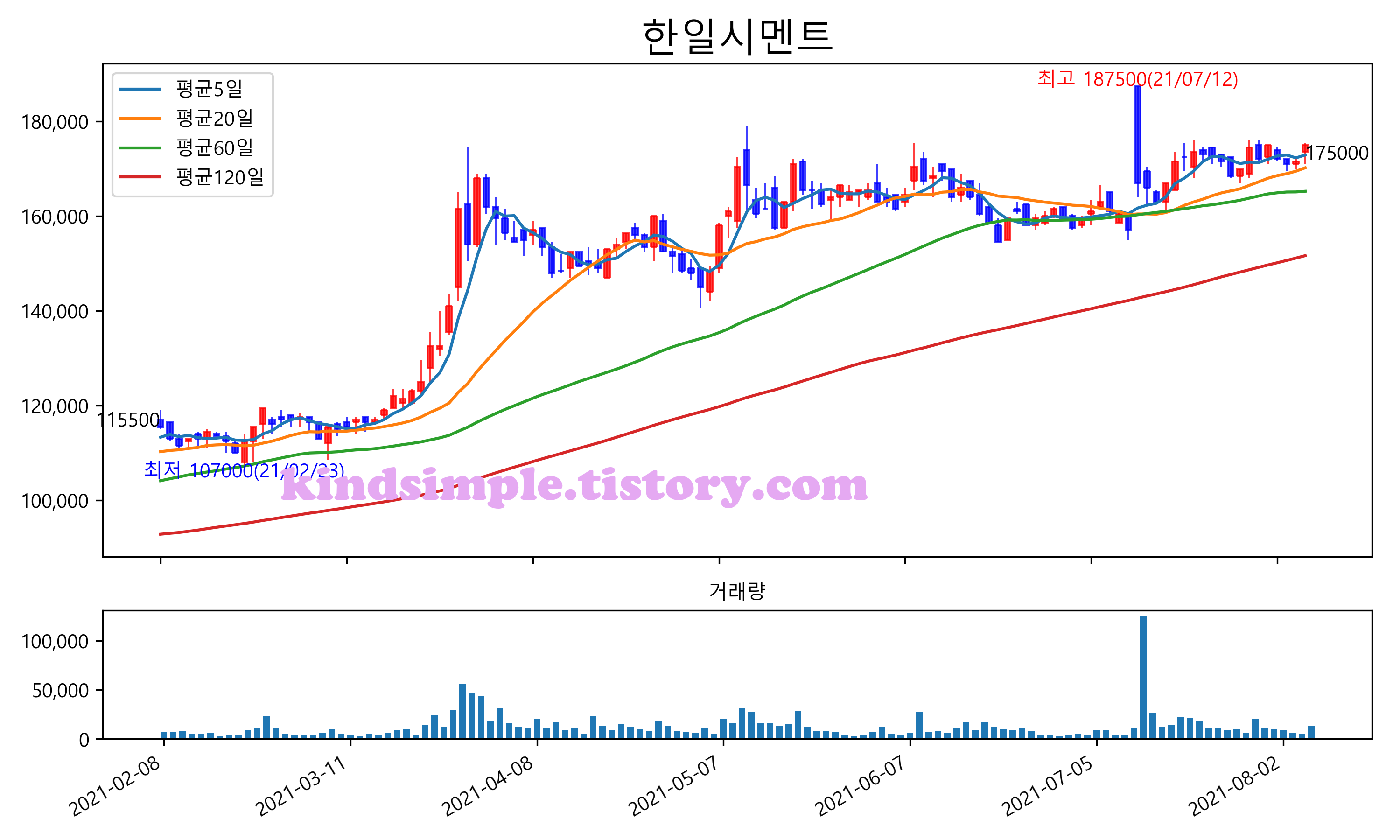 최근 6개월간 캔들차트 및 이동평균선입니다.