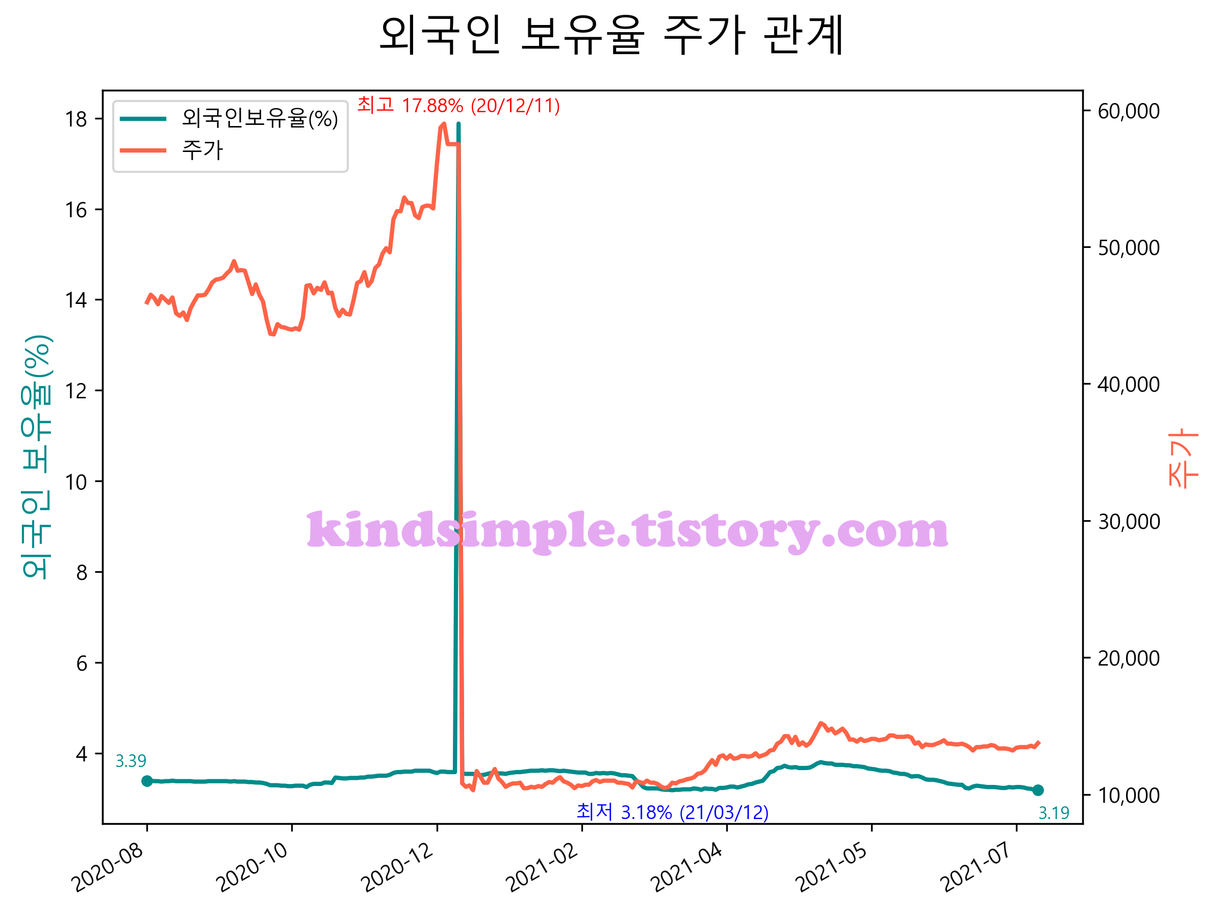 최근 1년간 외국인 보유율 및 주가와의 관계입니다.